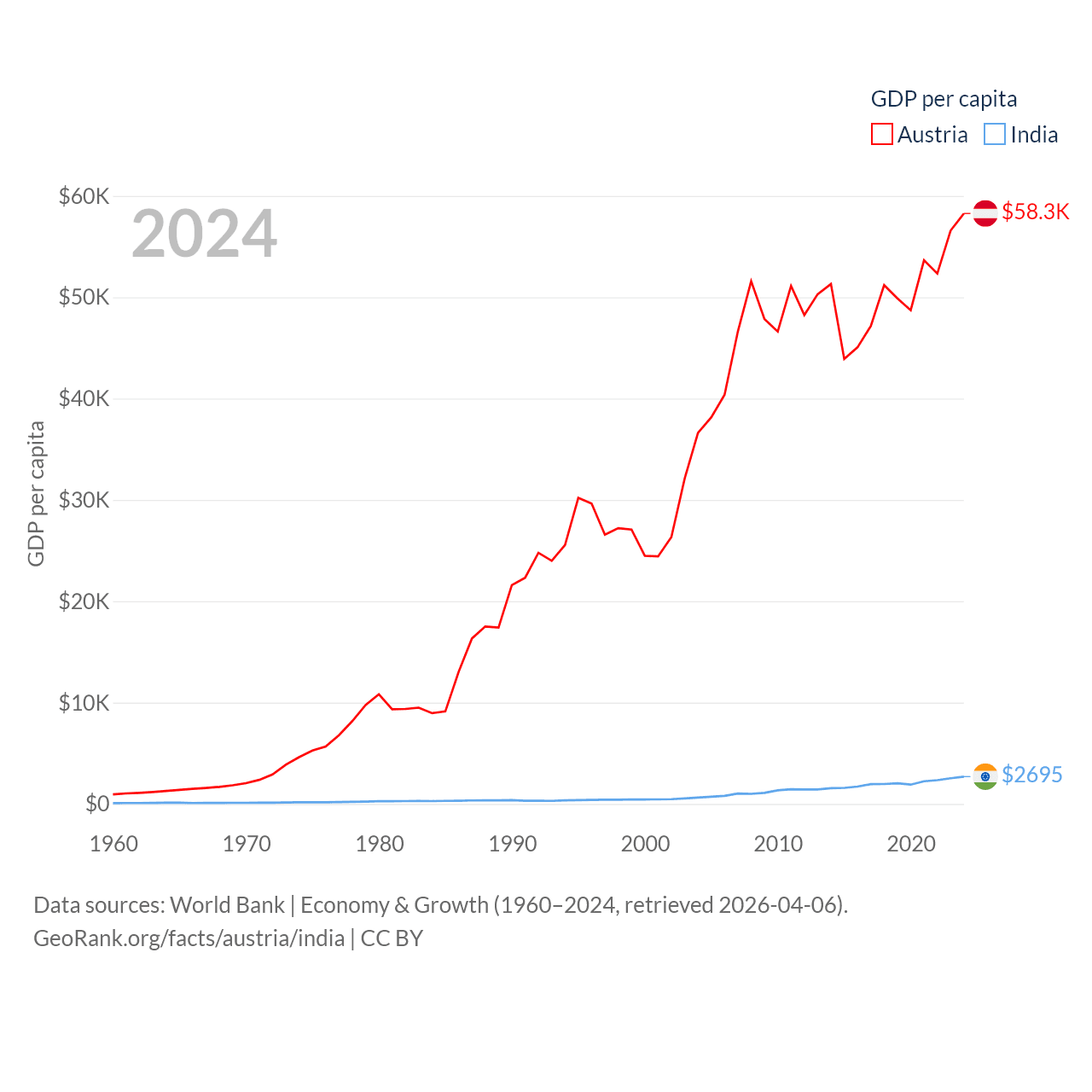 By GDP, Austria ranks 30/197 ($535B) and India ranks 5/197 ($3.91T). By GDP per capita, Austria ranks 16/197 ($58,269), while India ranks 143/197 ($2,695).