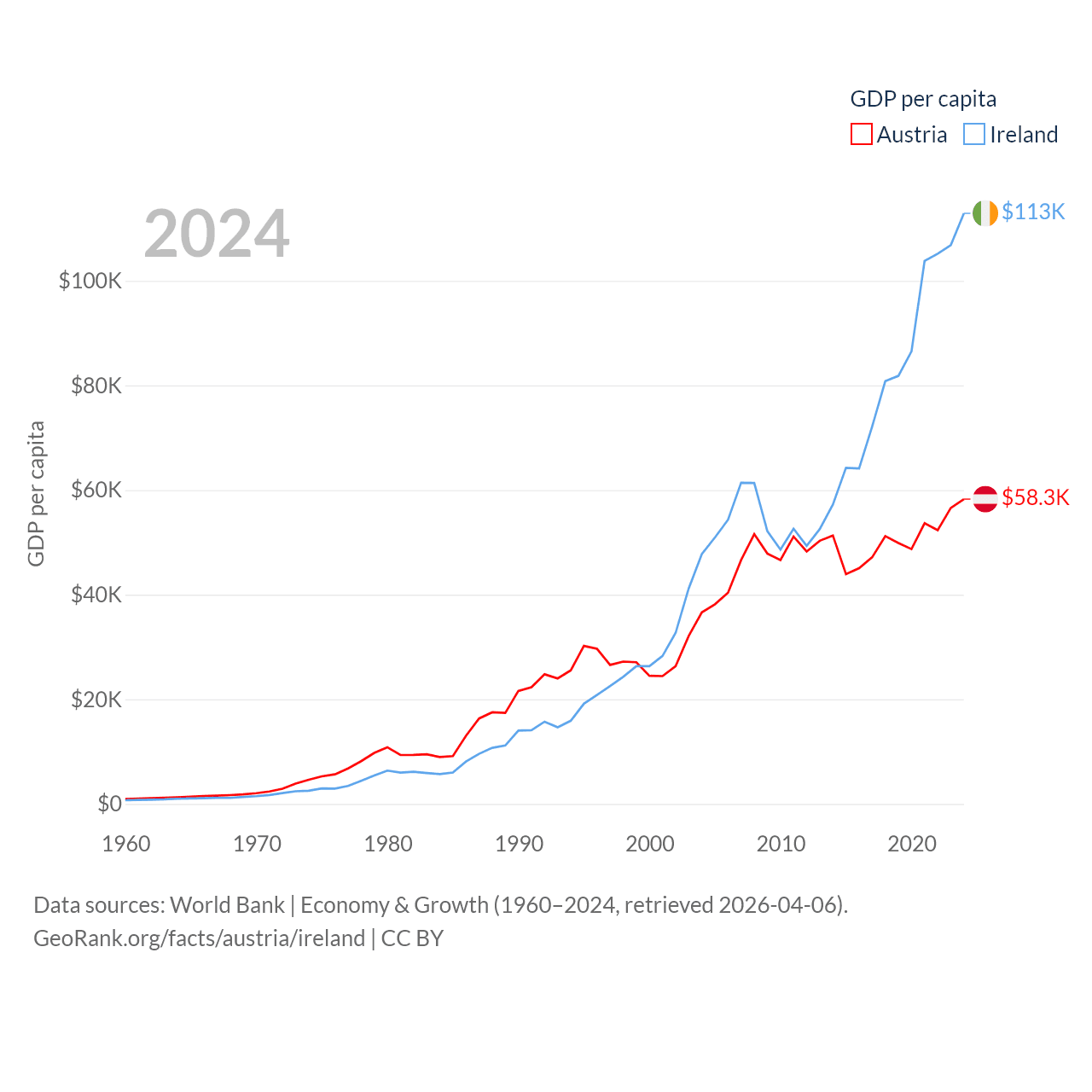By GDP, Austria ranks 30/197 ($535B) and Ireland ranks 25/197 ($609B). By GDP per capita, Austria ranks 16/197 ($58,269), while Ireland ranks 4/197 ($112,895).