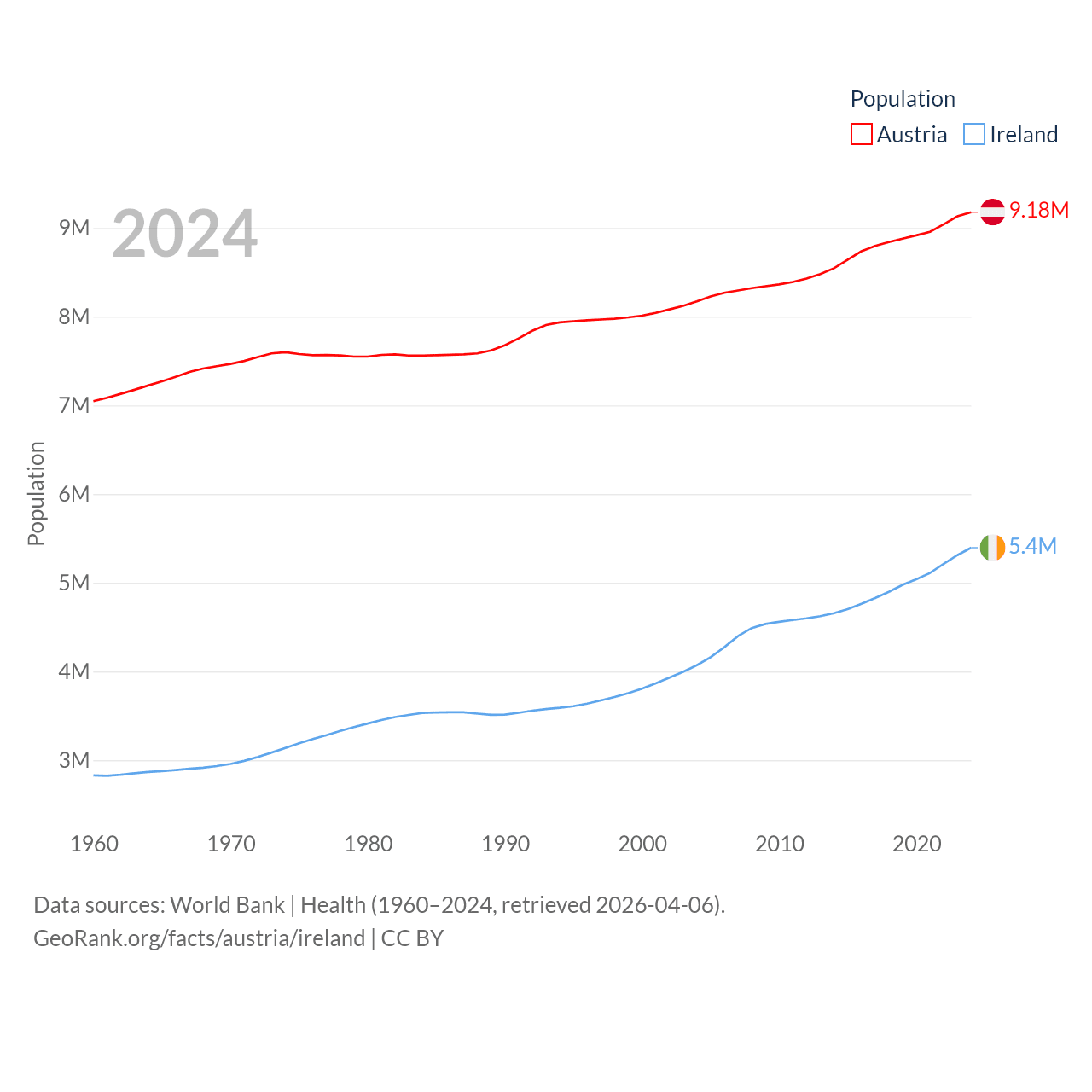 Austria has a population of 9.18M (ranked 99/197), compared with 5.4M in Ireland (ranked 120/197). Austria's land area is 31,861 sq mi versus 26,599 sq mi for Ireland (ranked 113th vs. 119th).
