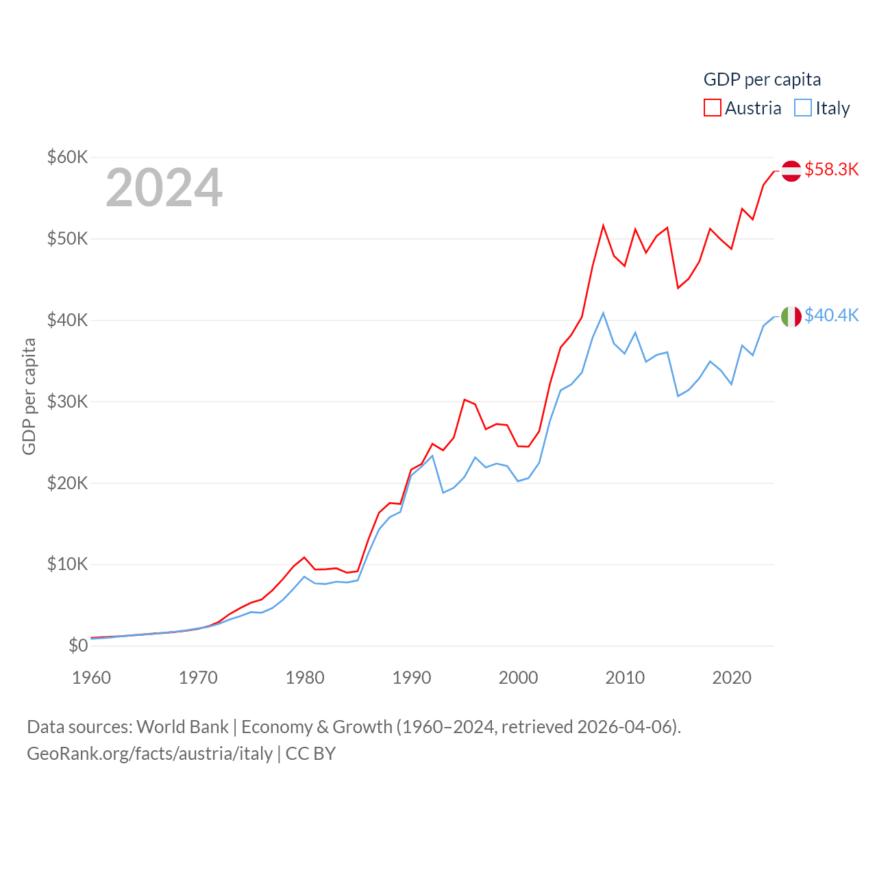 By GDP, Austria ranks 30/197 ($535B) and Italy ranks 8/197 ($2.38T). By GDP per capita, Austria ranks 16/197 ($58,269), while Italy ranks 29/197 ($40,385).