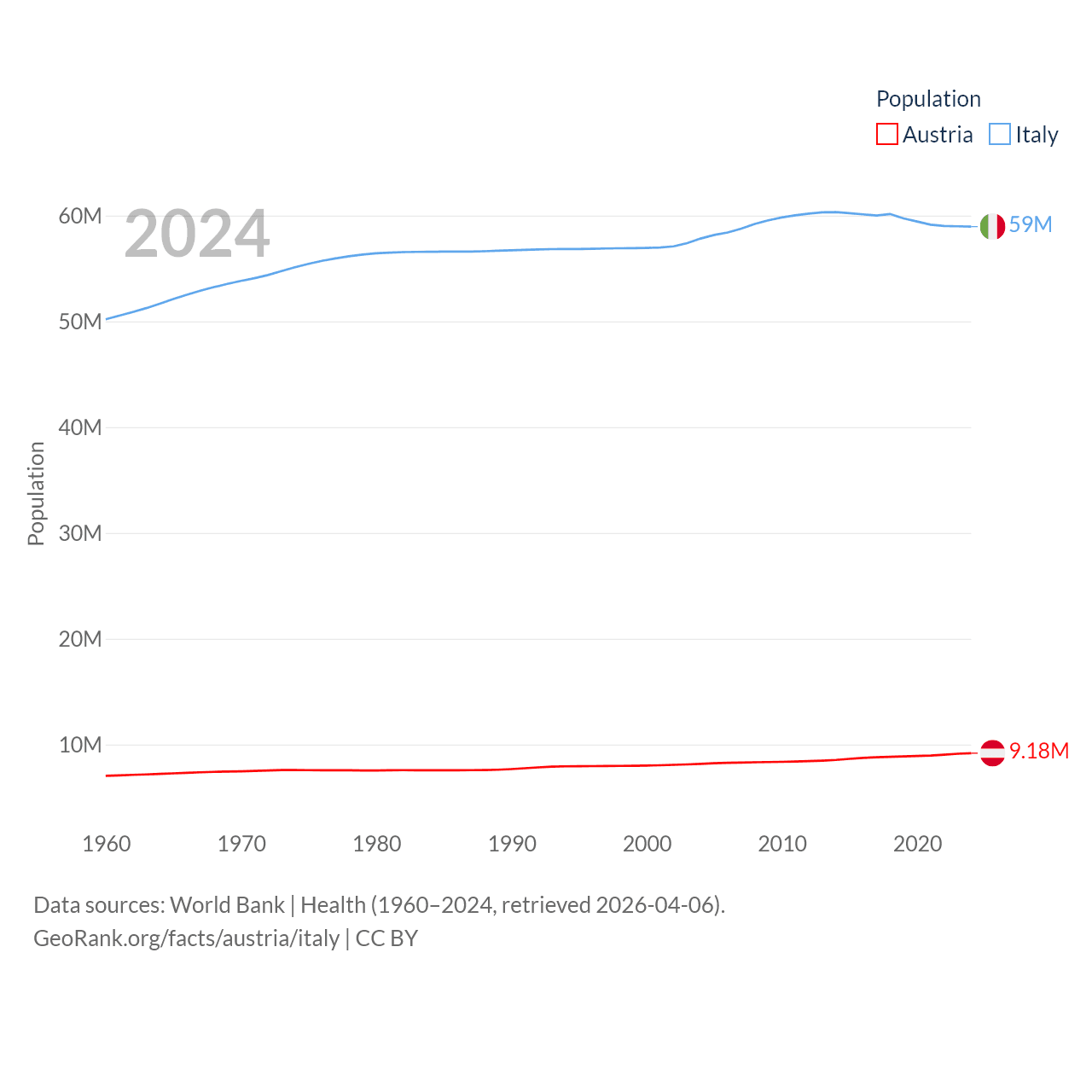 Austria has a population of 9.18M (ranked 99/197), compared with 59M in Italy (ranked 25/197). Austria's land area is 31,861 sq mi versus 114,178 sq mi for Italy (ranked 113th vs. 72nd).