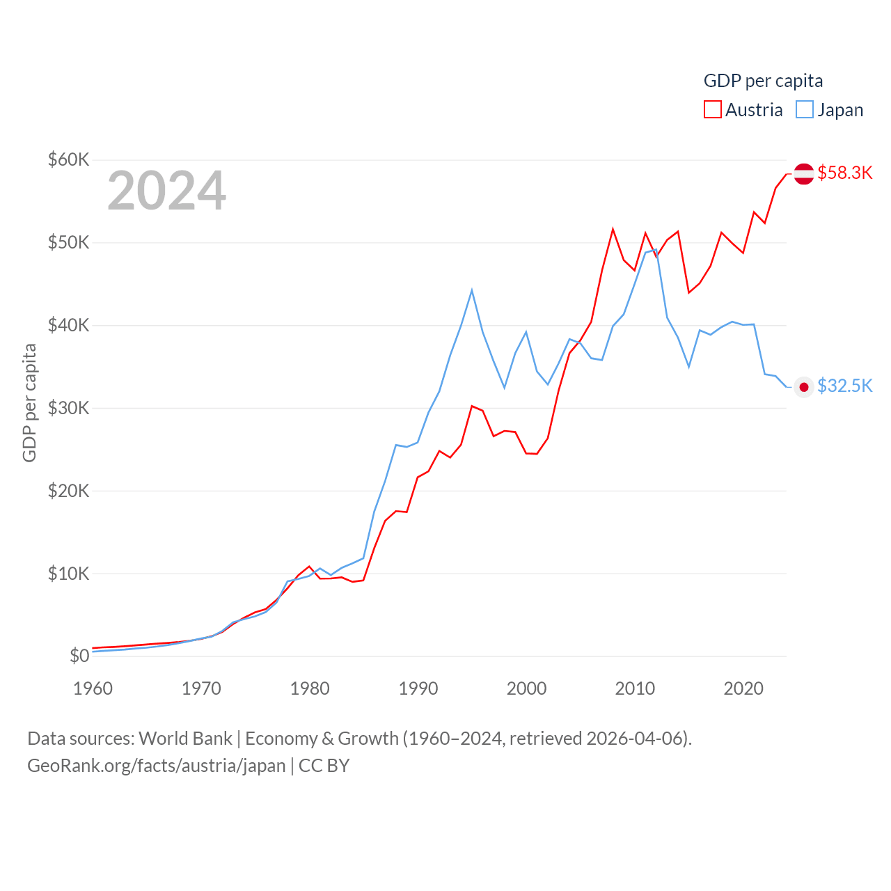 By GDP, Austria ranks 30/197 ($535B) and Japan ranks 4/197 ($4.03T). By GDP per capita, Austria ranks 16/197 ($58,269), while Japan ranks 38/197 ($32,487).