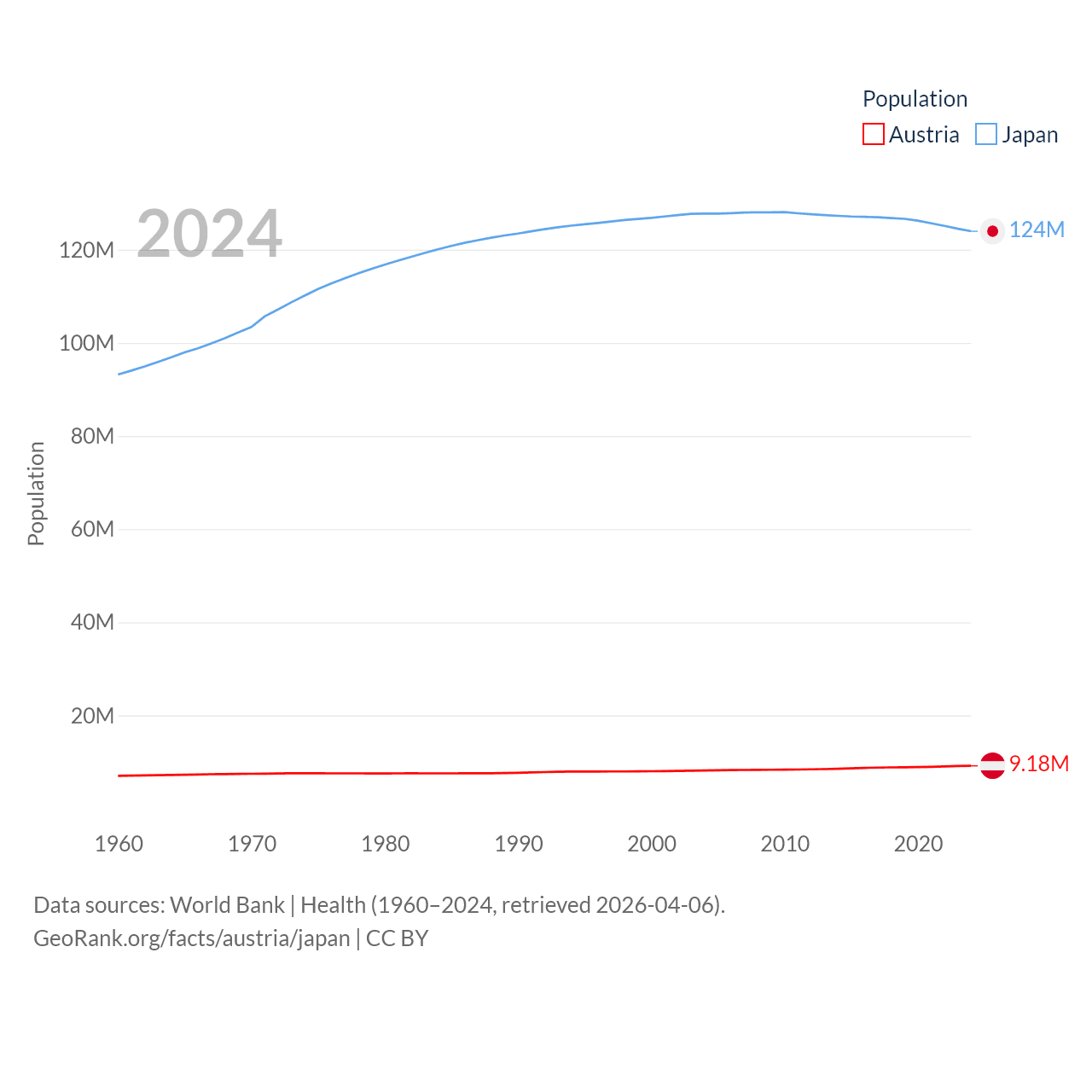 Austria has a population of 9.18M (ranked 99/197), compared with 124M in Japan (ranked 12/197). Austria's land area is 31,861 sq mi versus 140,761 sq mi for Japan (ranked 113th vs. 61st).
