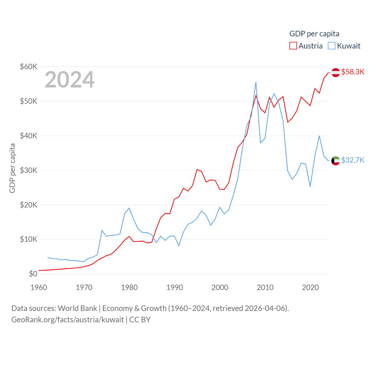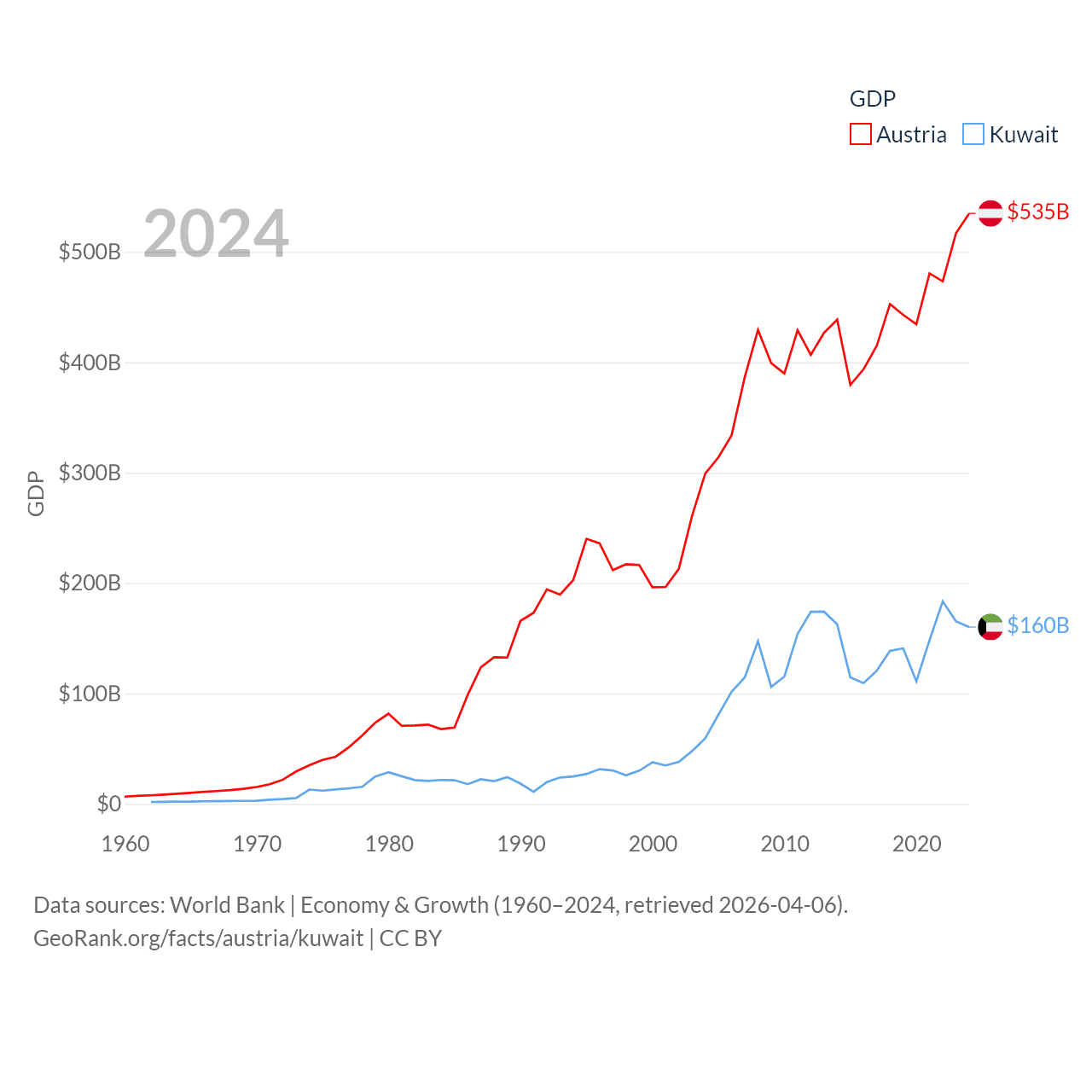 By GDP, Austria ranks 30/197 ($535B) and Kuwait ranks 59/197 ($160B). By GDP per capita, Austria ranks 16/197 ($58,269), while Kuwait ranks 37/197 ($32,718).