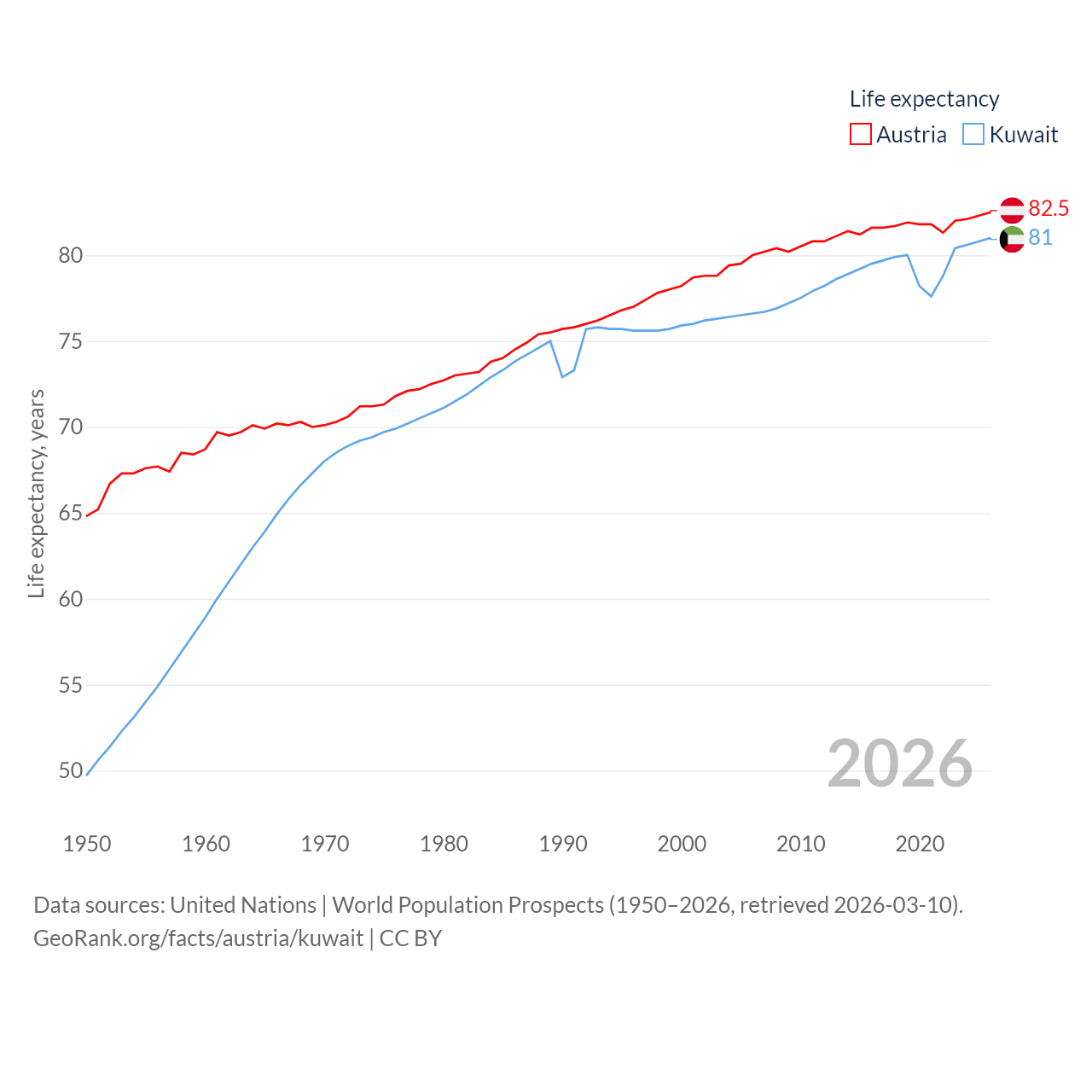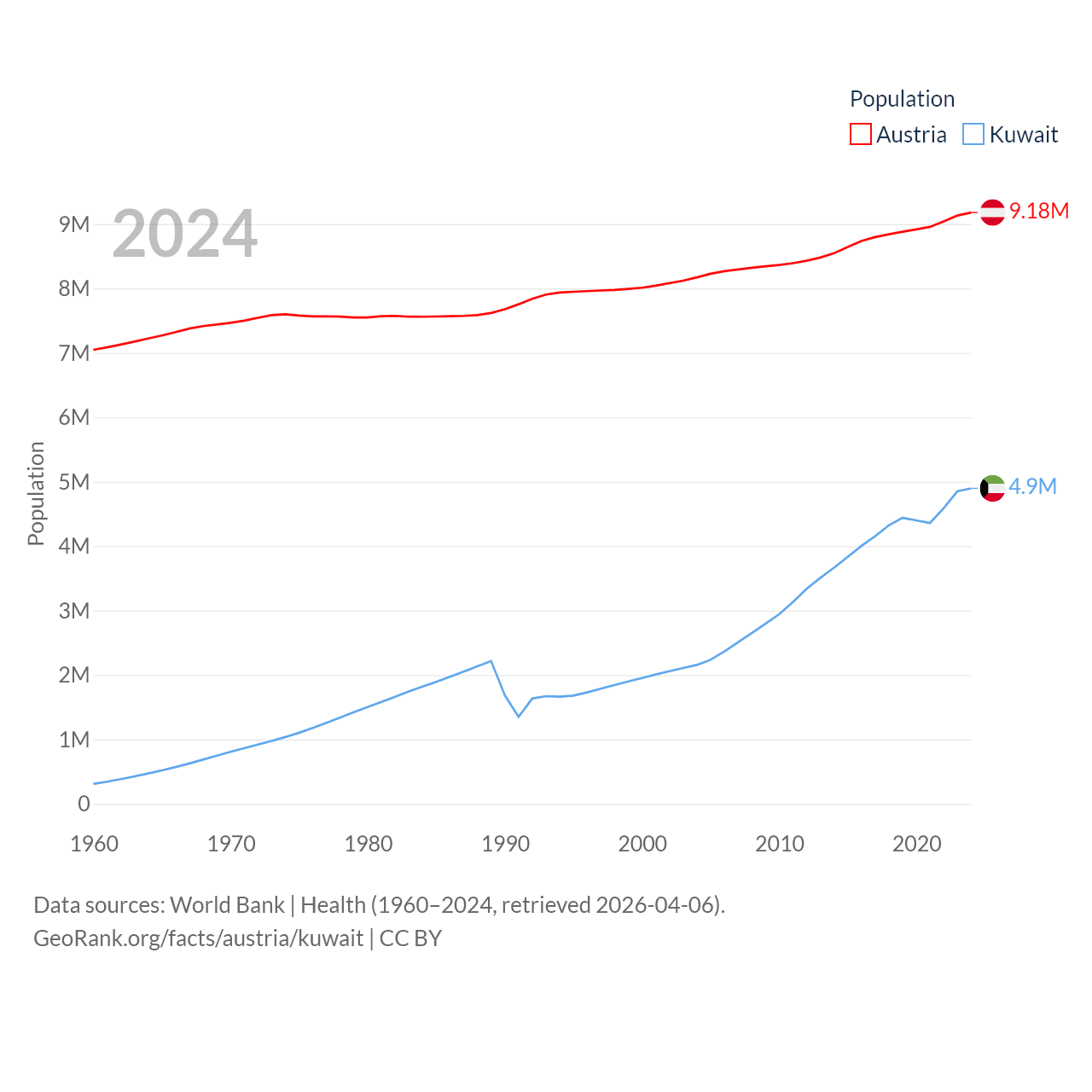 Austria has a population of 9.18M (ranked 99/197), compared with 4.9M in Kuwait (ranked 127/197). Austria's land area is 31,861 sq mi versus 6,880 sq mi for Kuwait (ranked 113th vs. 153rd).