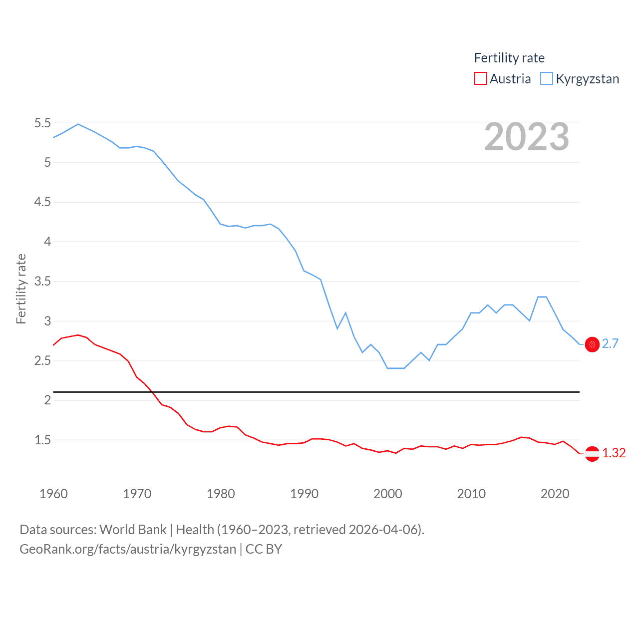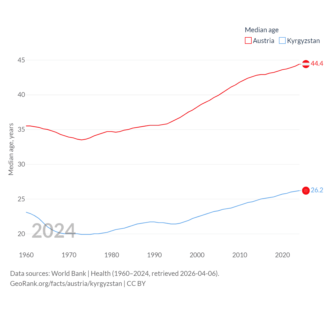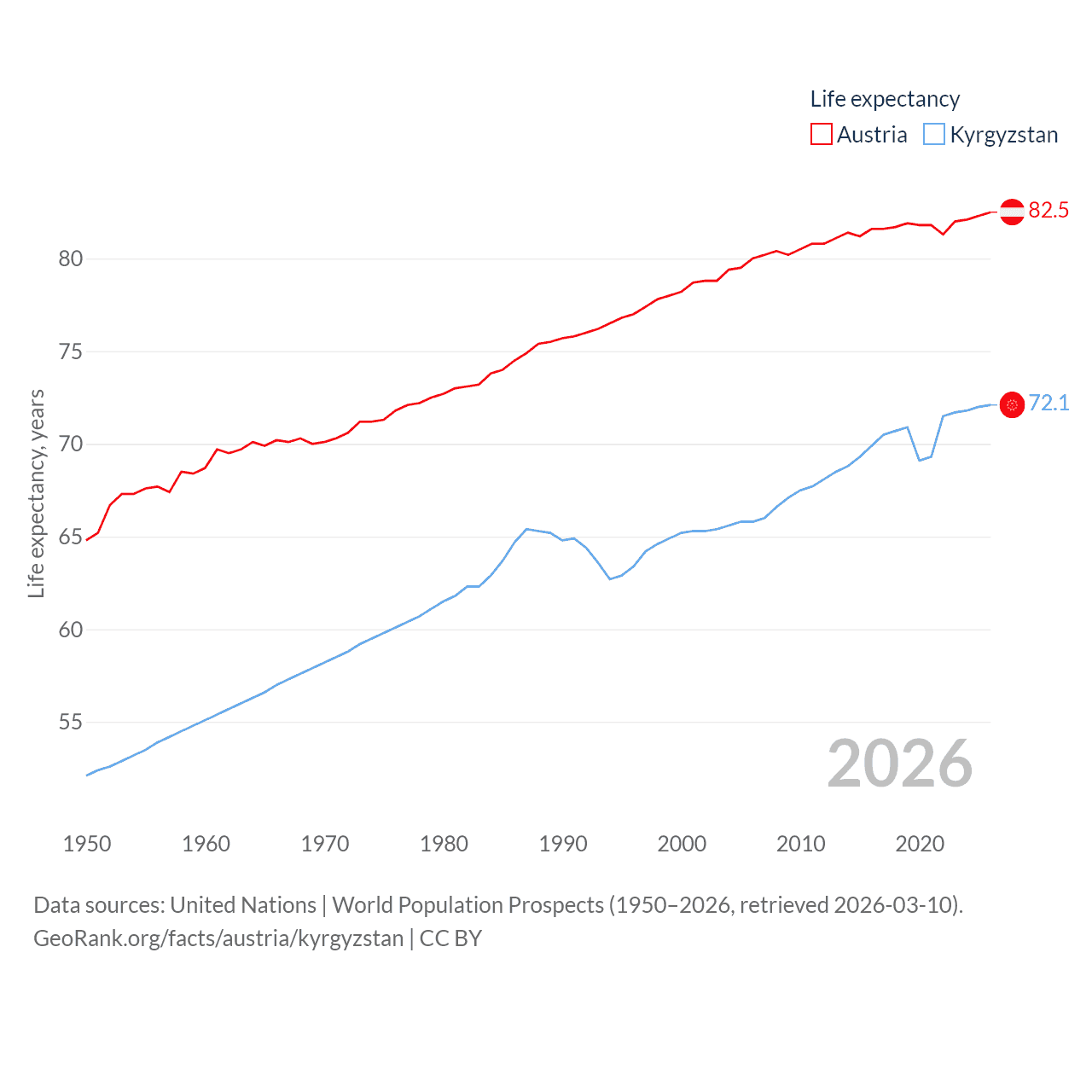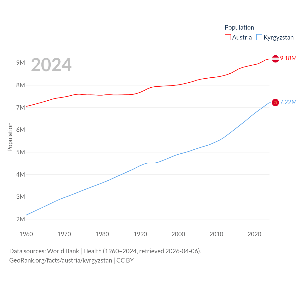 Austria has a population of 9.18M (ranked 99/197), compared with 7.22M in Kyrgyzstan (ranked 106/197). Austria's land area is 31,861 sq mi versus 74,054 sq mi for Kyrgyzstan (ranked 113th vs. 86th).