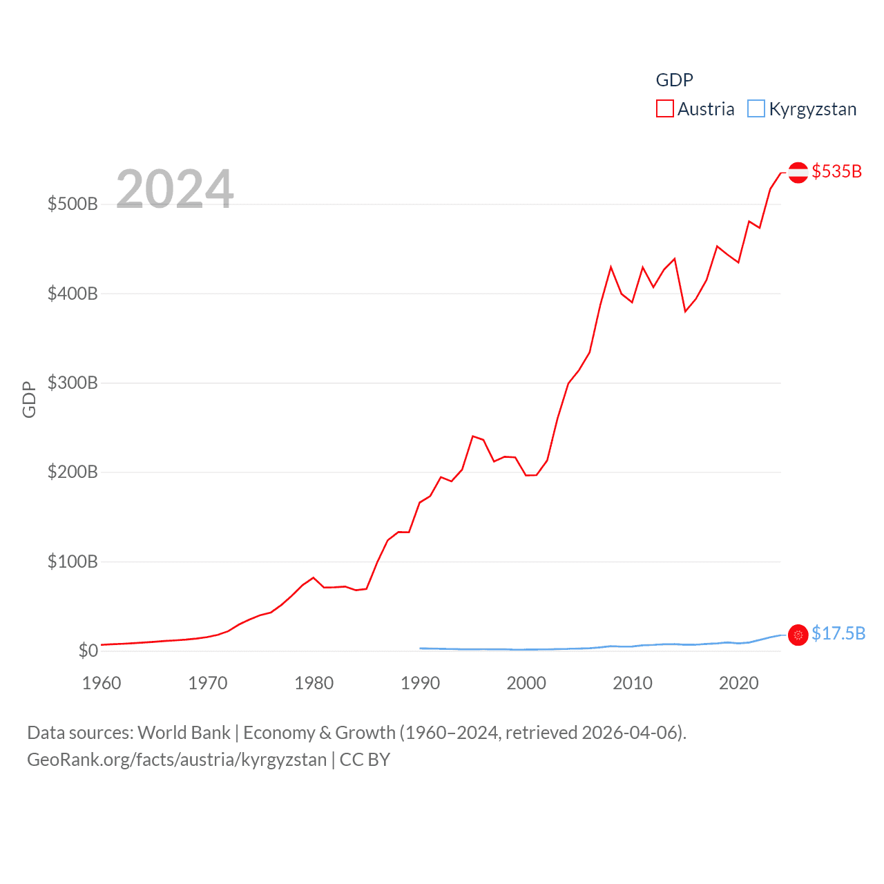 By GDP, Austria ranks 30/197 ($535B) and Kyrgyzstan ranks 135/197 ($17.5B). By GDP per capita, Austria ranks 16/197 ($58,269), while Kyrgyzstan ranks 150/197 ($2,420).