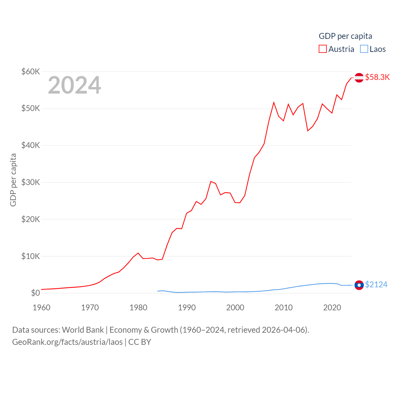 By GDP, Austria ranks 30/197 ($535B) and Laos ranks 139/197 ($16.5B). By GDP per capita, Austria ranks 16/197 ($58,269), while Laos ranks 155/197 ($2,124).