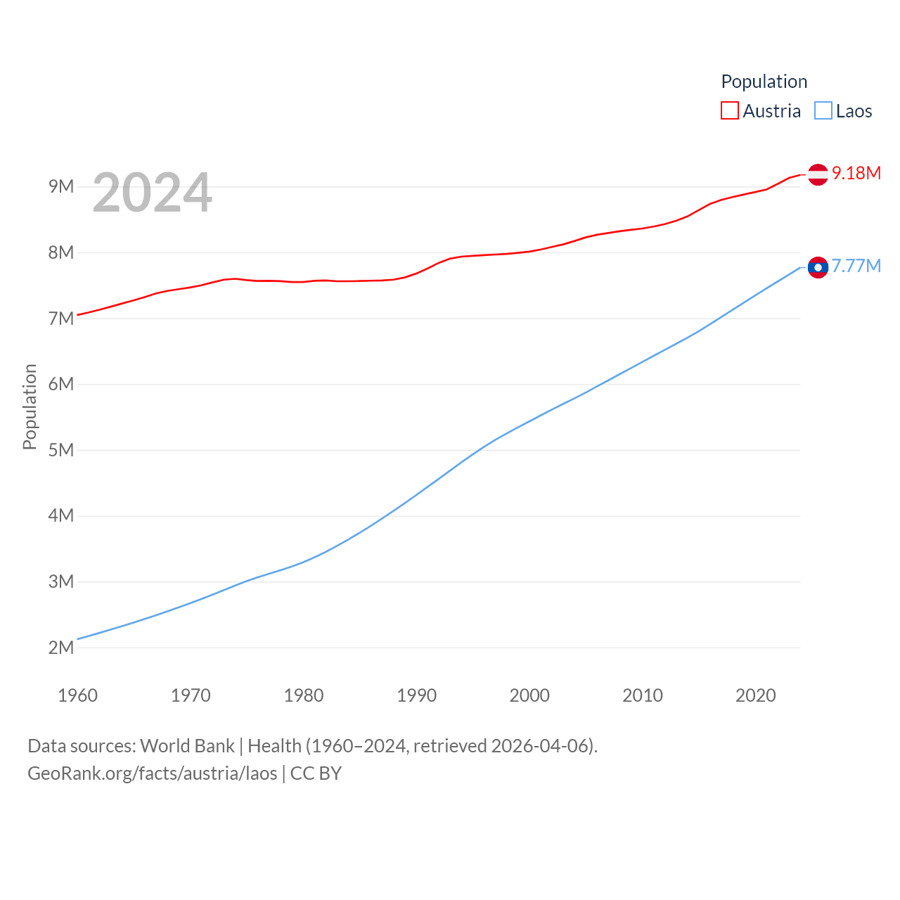 Austria has a population of 9.18M (ranked 99/197), compared with 7.77M in Laos (ranked 103/197). Austria's land area is 31,861 sq mi versus 89,112 sq mi for Laos (ranked 113th vs. 79th).