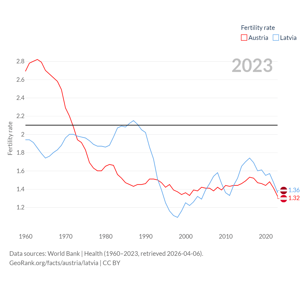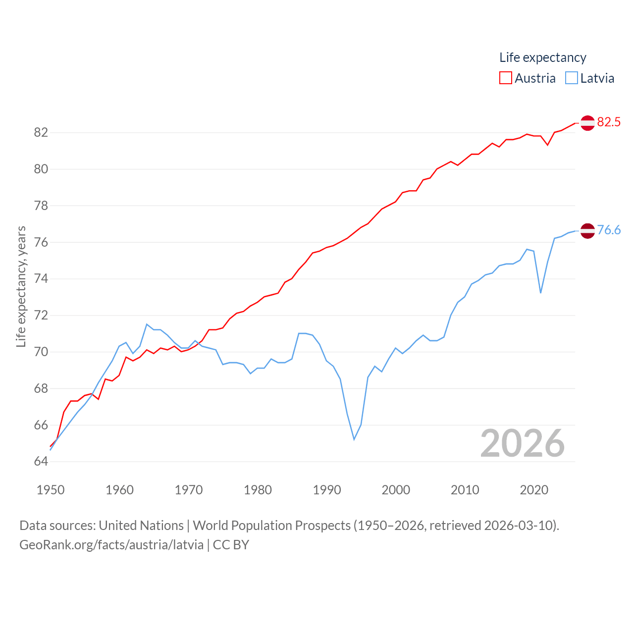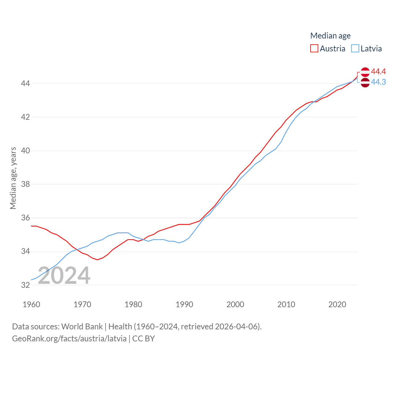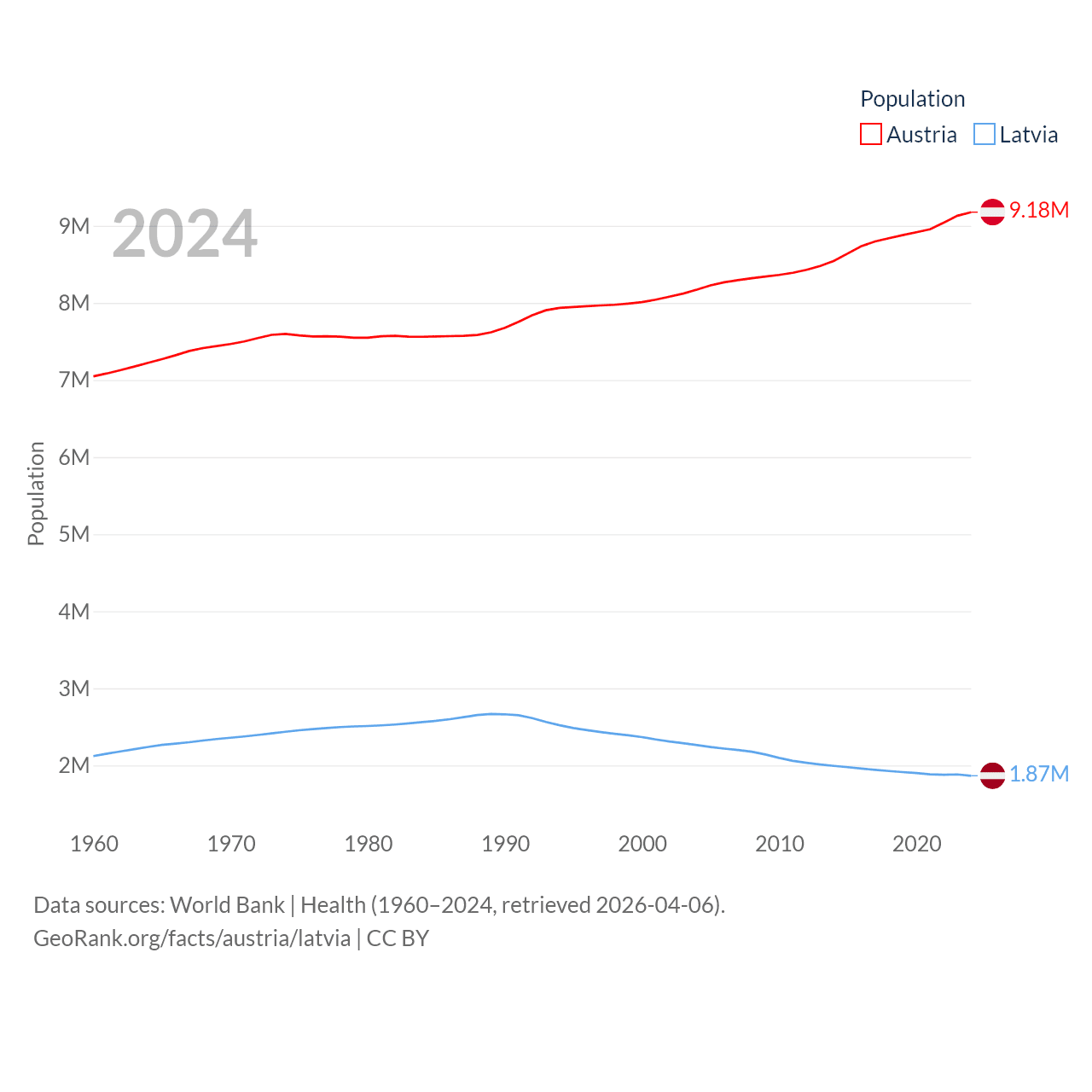 Austria has a population of 9.18M (ranked 99/197), compared with 1.87M in Latvia (ranked 149/197). Austria's land area is 31,861 sq mi versus 24,027 sq mi for Latvia (ranked 113th vs. 121st).
