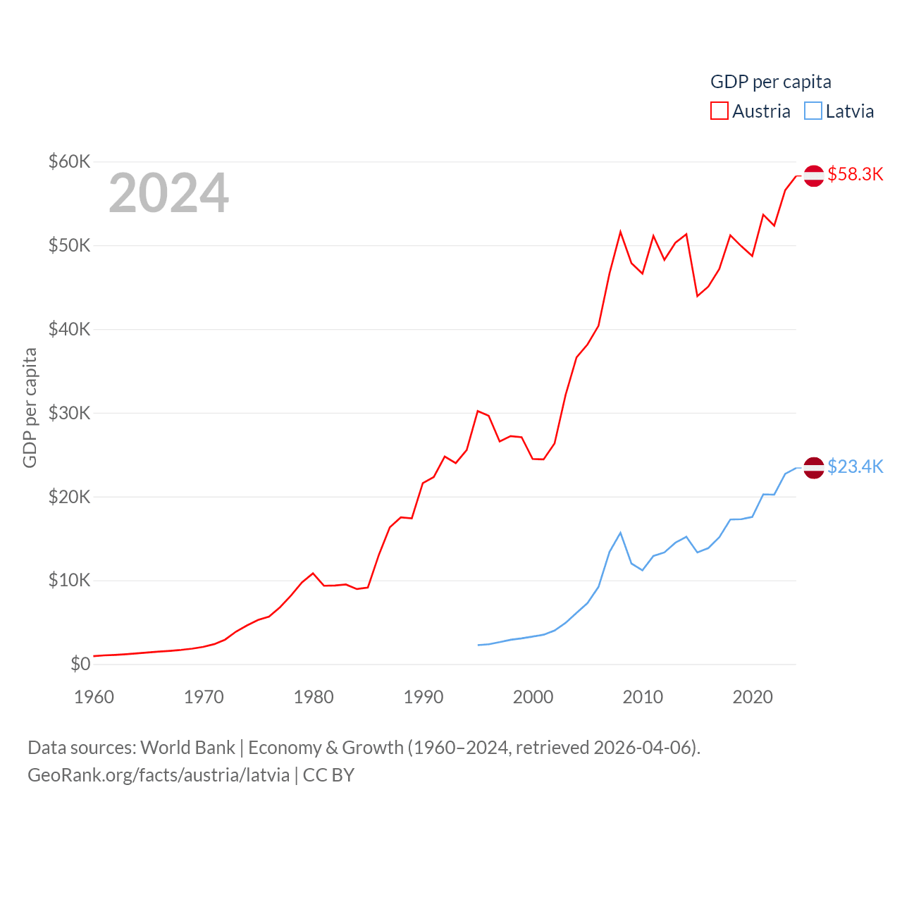 By GDP, Austria ranks 30/197 ($535B) and Latvia ranks 99/197 ($43.7B). By GDP per capita, Austria ranks 16/197 ($58,269), while Latvia ranks 54/197 ($23,409).