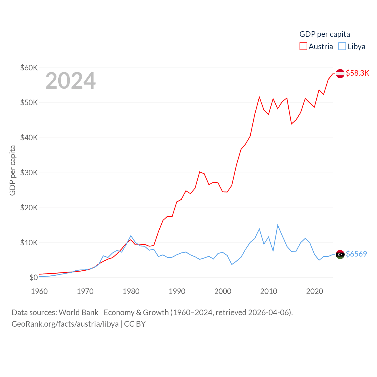 By GDP, Austria ranks 30/197 ($535B) and Libya ranks 95/197 ($48.5B). By GDP per capita, Austria ranks 16/197 ($58,269), while Libya ranks 107/197 ($6,569).