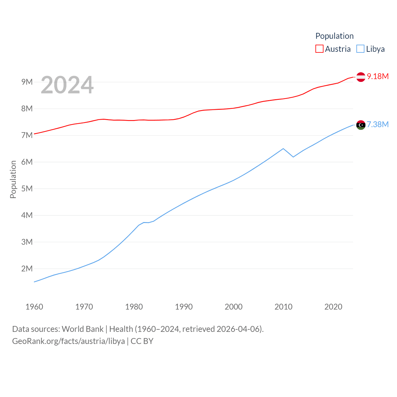 Austria has a population of 9.18M (ranked 99/197), compared with 7.38M in Libya (ranked 105/197). Austria's land area is 31,861 sq mi versus 679,362 sq mi for Libya (ranked 113th vs. 16th).