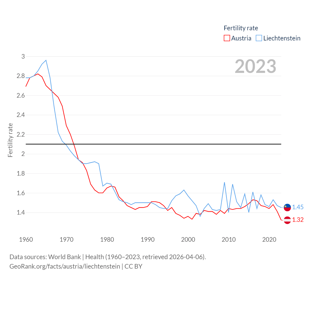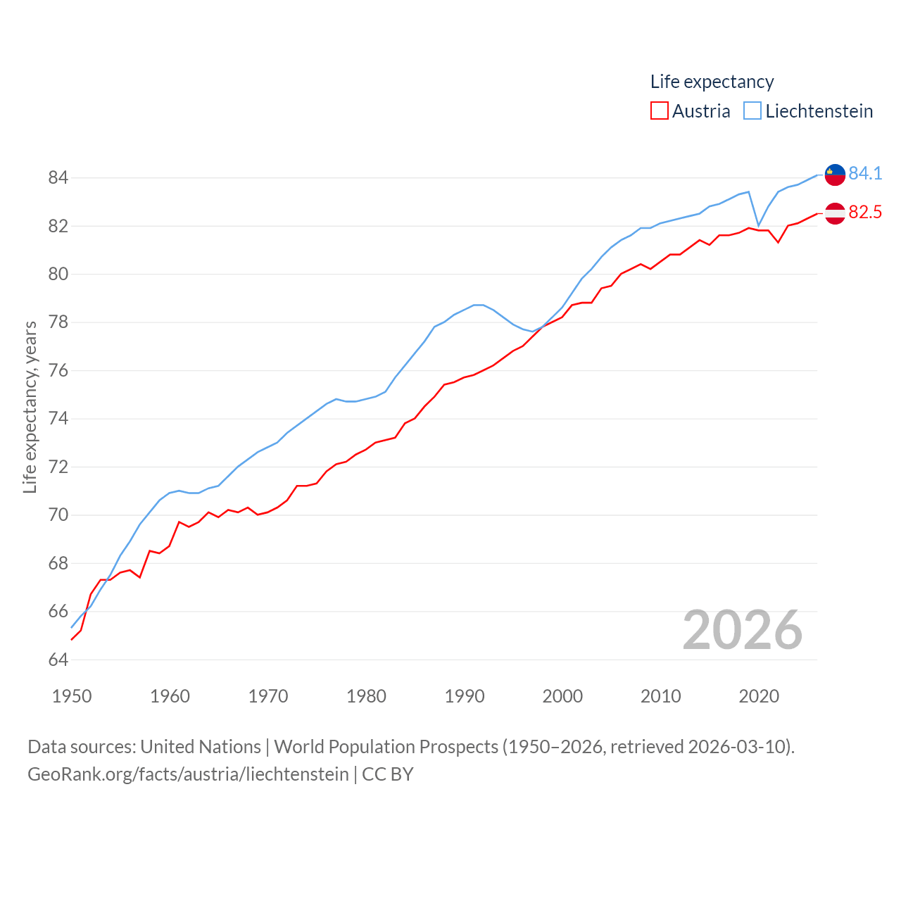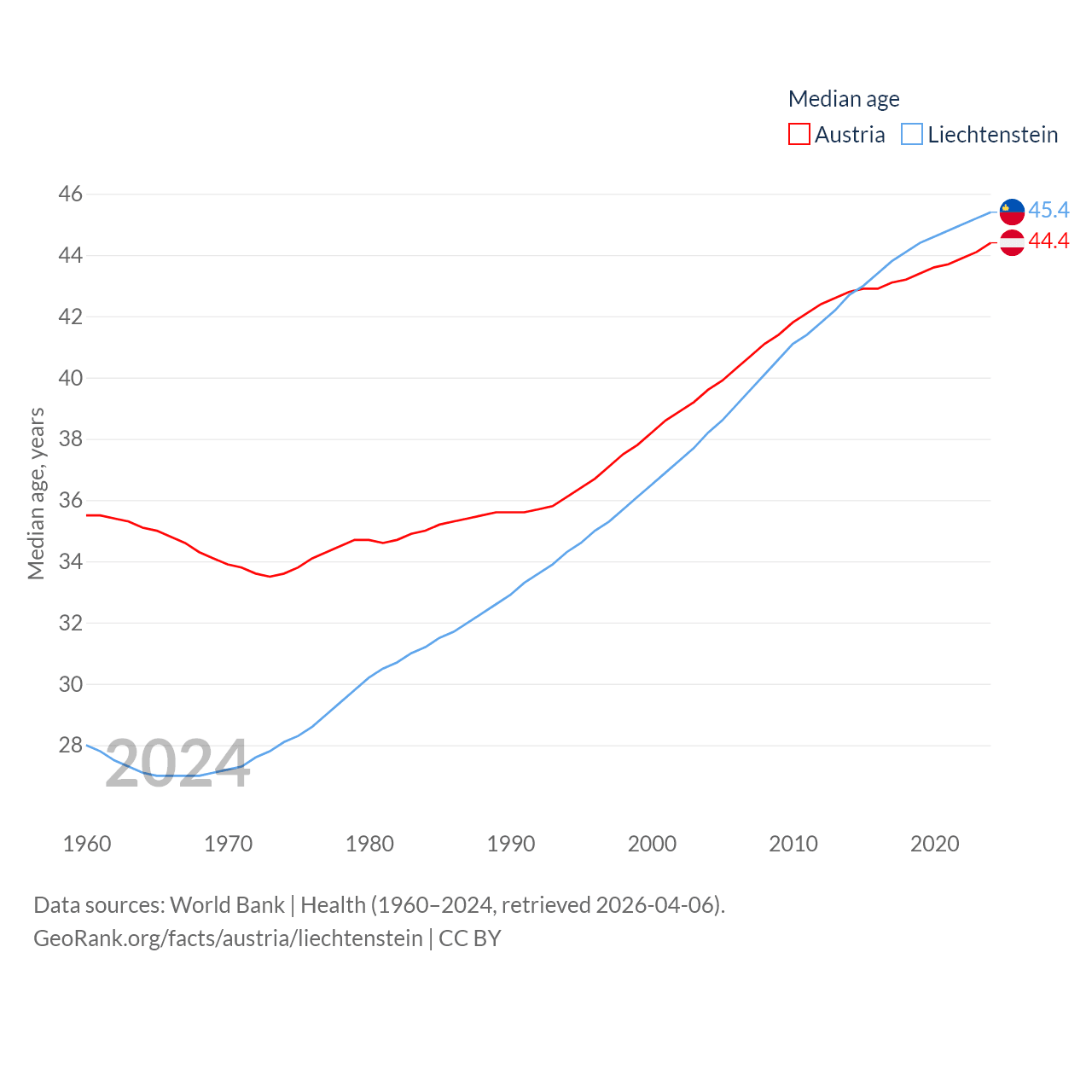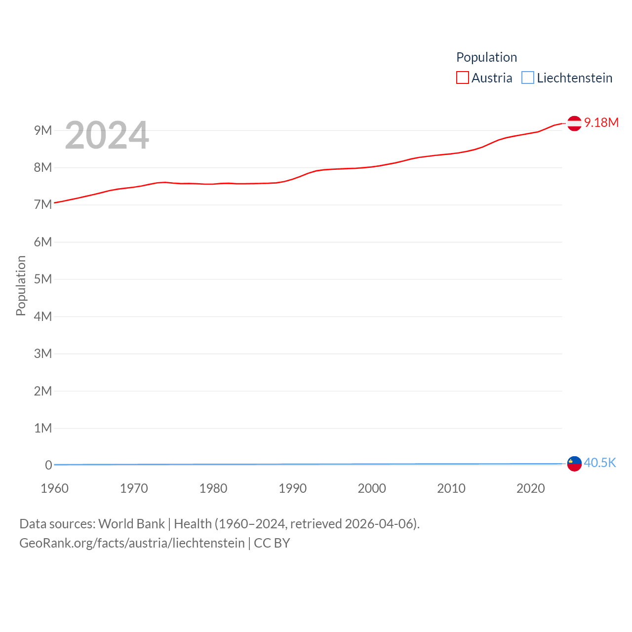 Austria has a population of 9.18M (ranked 99/197), compared with 40.4K in Liechtenstein (ranked 190/197). Austria's land area is 31,861 sq mi versus 61.8 sq mi for Liechtenstein (ranked 113th vs. 192nd).