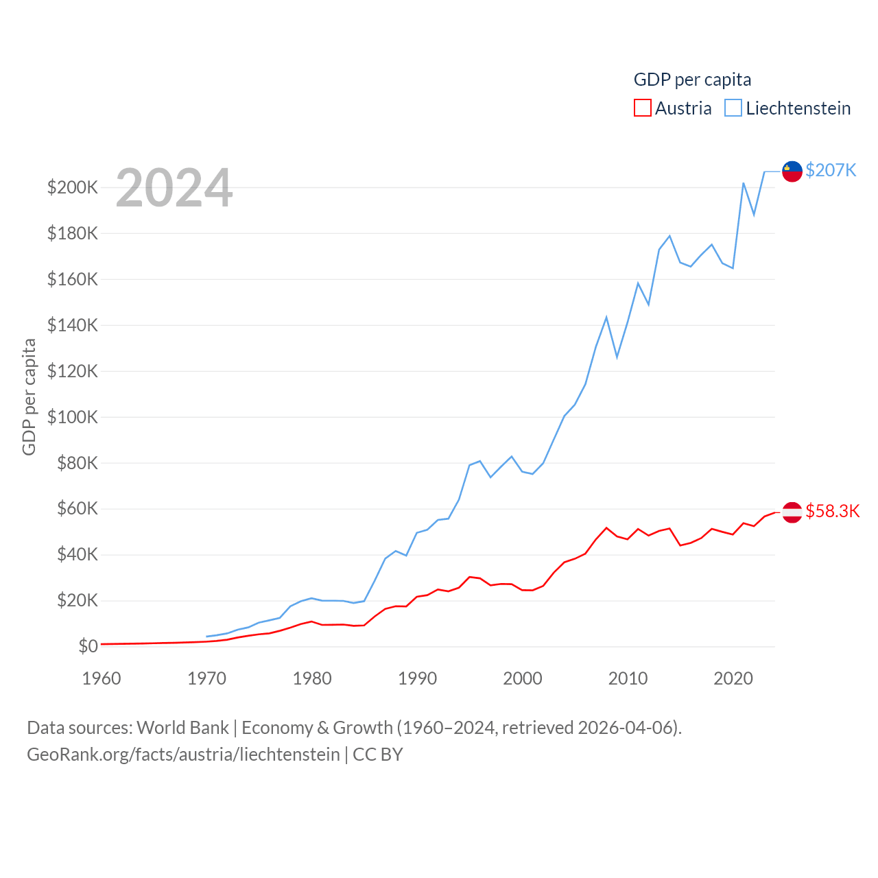 By GDP, Austria ranks 30/197 ($535B) and Liechtenstein ranks 156/197 ($8.24B). By GDP per capita, Austria ranks 16/197 ($58,269), while Liechtenstein ranks 2/197 ($206,781).