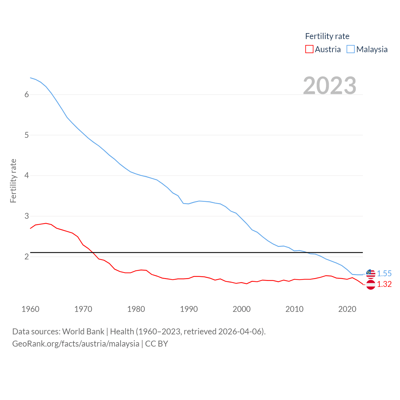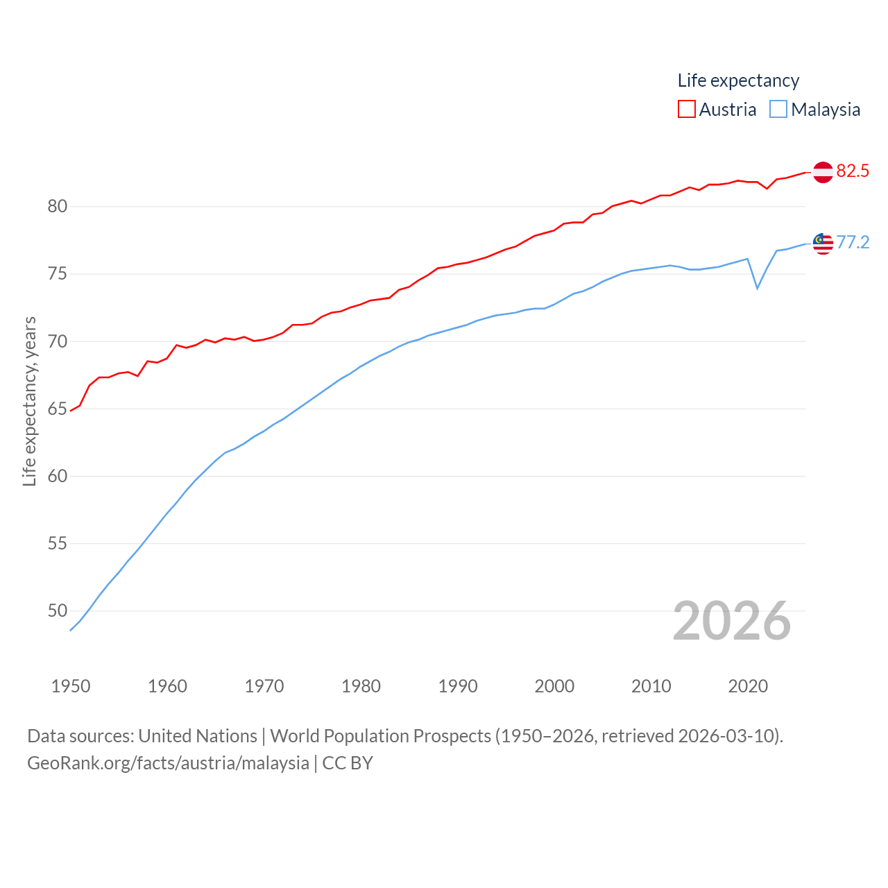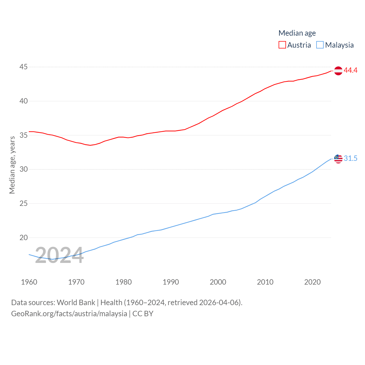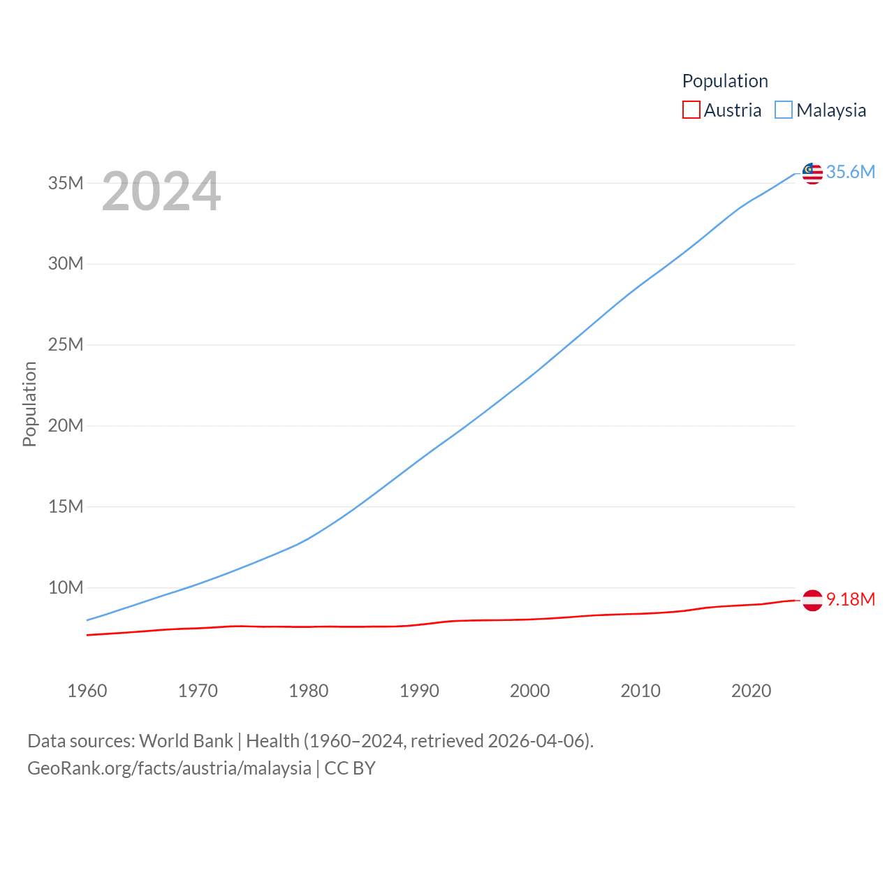 Austria has a population of 9.18M (ranked 99/197), compared with 35.6M in Malaysia (ranked 44/197). Austria's land area is 31,861 sq mi versus 126,854 sq mi for Malaysia (ranked 113th vs. 65th).