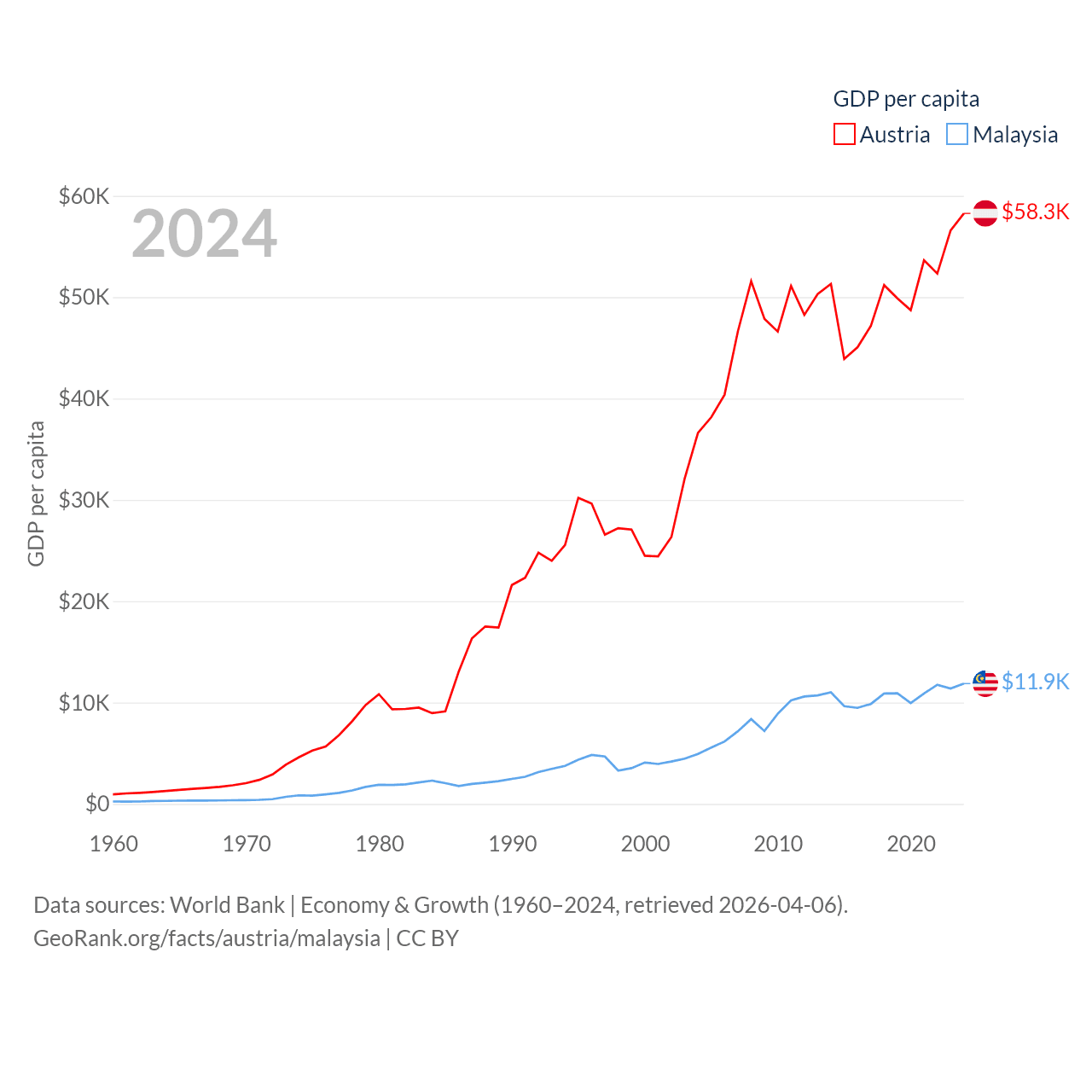 By GDP, Austria ranks 30/197 ($535B) and Malaysia ranks 38/197 ($422B). By GDP per capita, Austria ranks 16/197 ($58,269), while Malaysia ranks 79/197 ($11,874).
