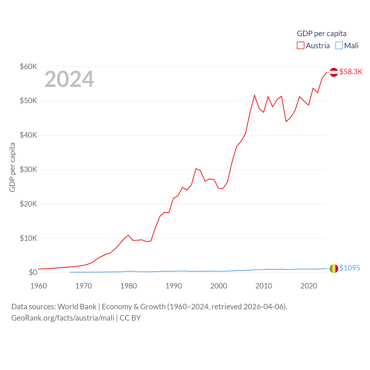 By GDP, Austria ranks 30/197 ($535B) and Mali ranks 113/197 ($26.8B). By GDP per capita, Austria ranks 16/197 ($58,269), while Mali ranks 173/197 ($1,095).