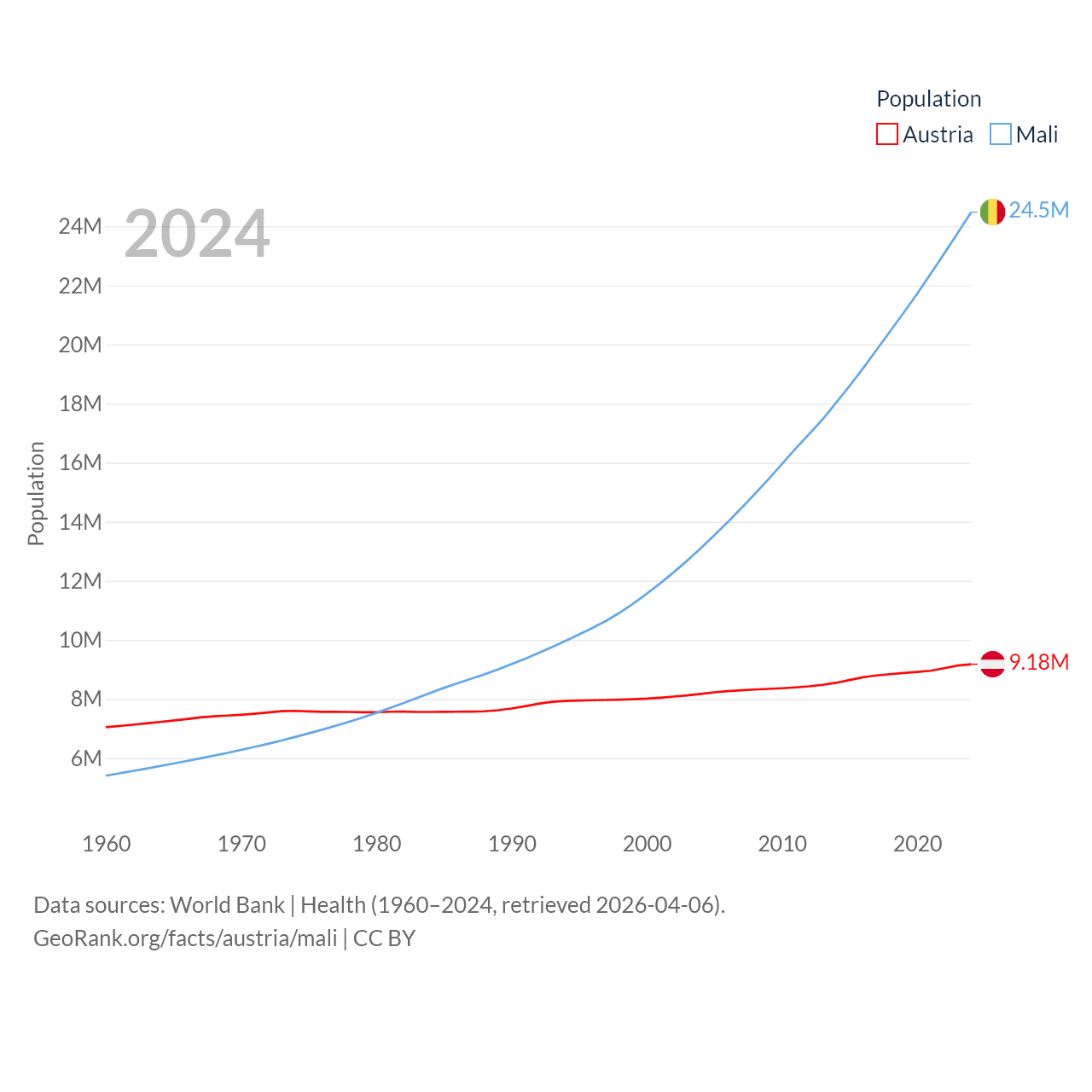 Austria has a population of 9.18M (ranked 99/197), compared with 24.5M in Mali (ranked 58/197). Austria's land area is 31,861 sq mi versus 471,118 sq mi for Mali (ranked 113th vs. 23rd).