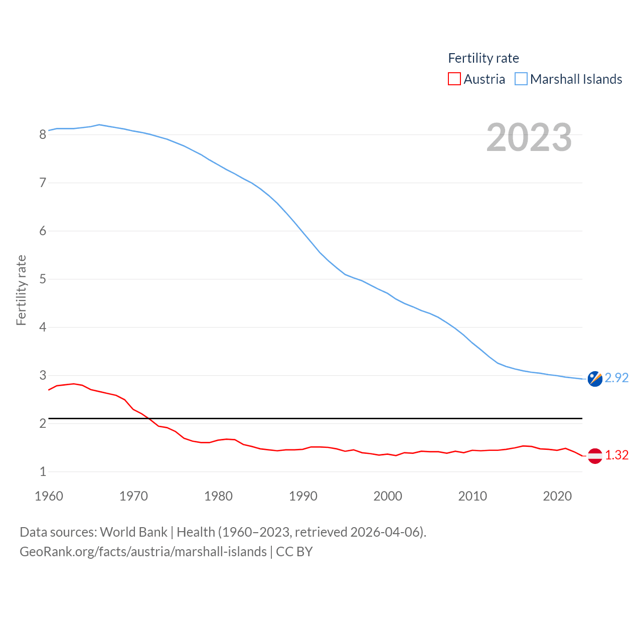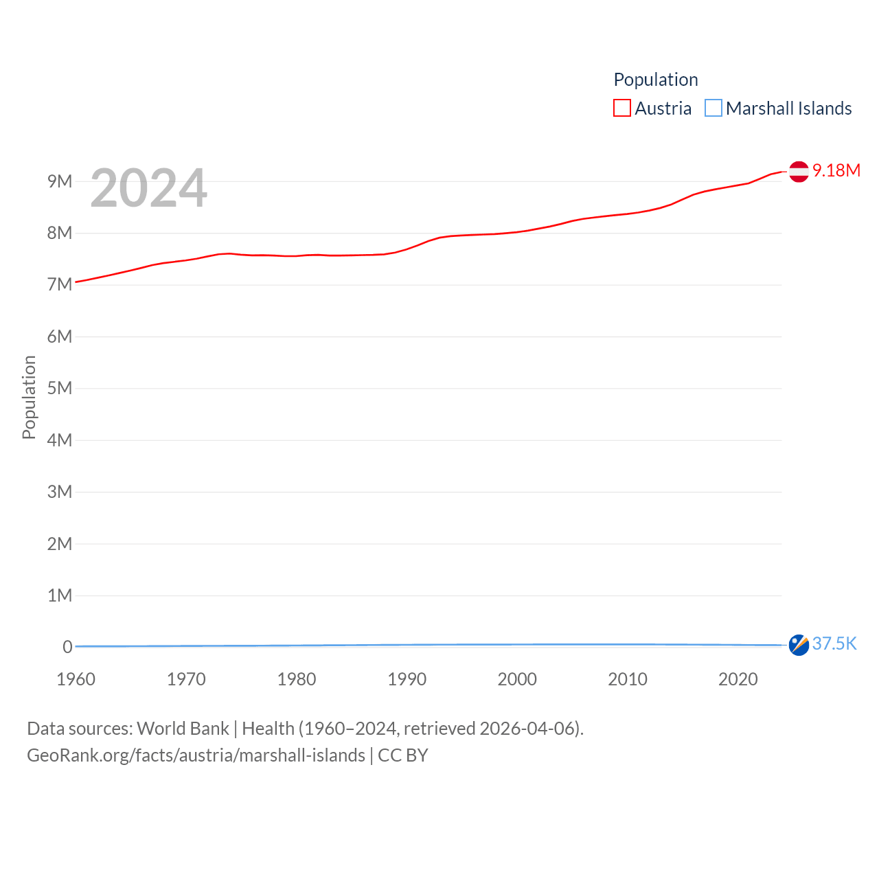 Austria has a population of 9.18M (ranked 99/197), compared with 37.5K in The Marshall Islands (ranked 192/197). Austria's land area is 31,861 sq mi versus 69.5 sq mi for The Marshall Islands (ranked 113th vs. 191st).