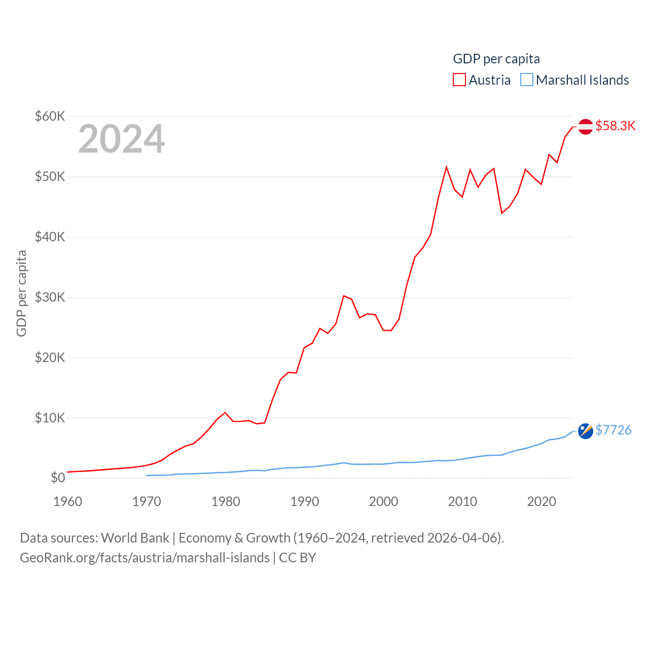 By GDP, Austria ranks 30/197 ($535B) and The Marshall Islands ranks 193/197 ($290M). By GDP per capita, Austria ranks 16/197 ($58,269), while The Marshall Islands ranks 96/197 ($7,726).