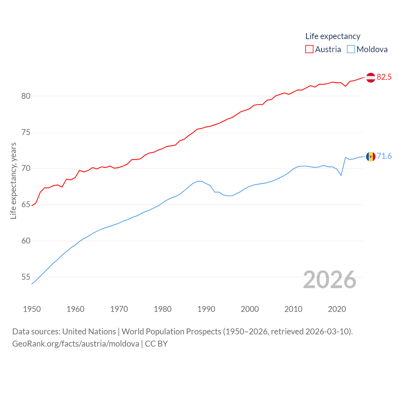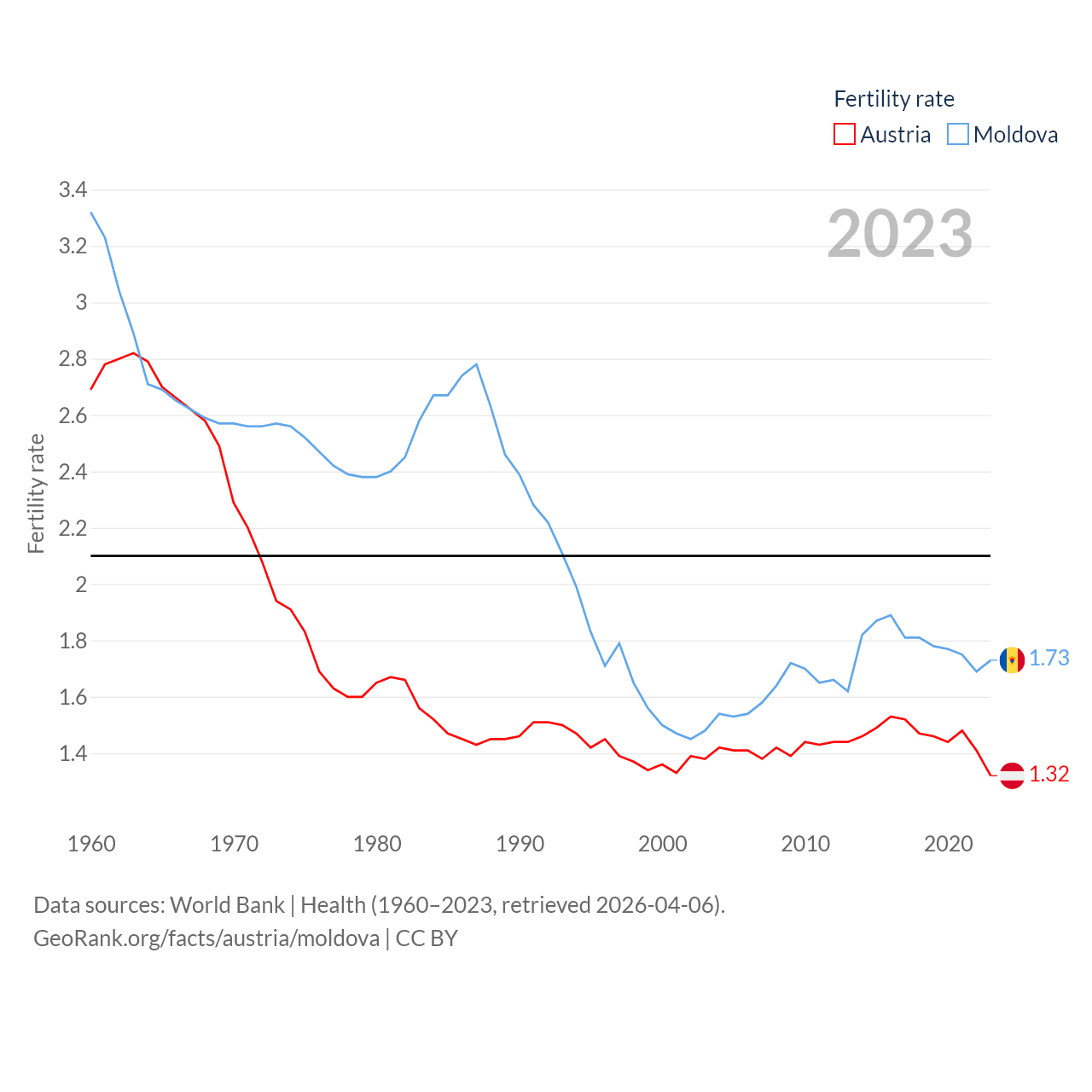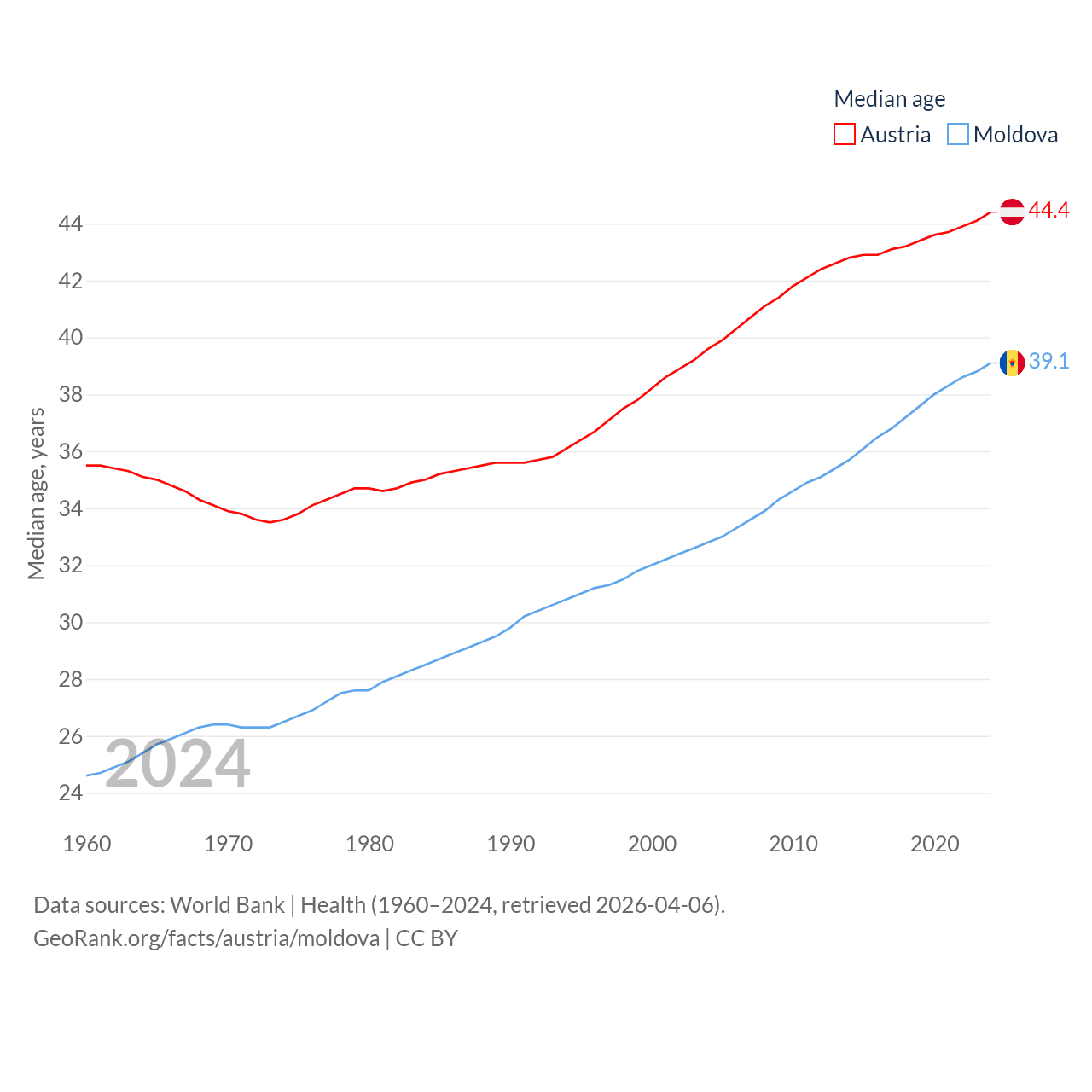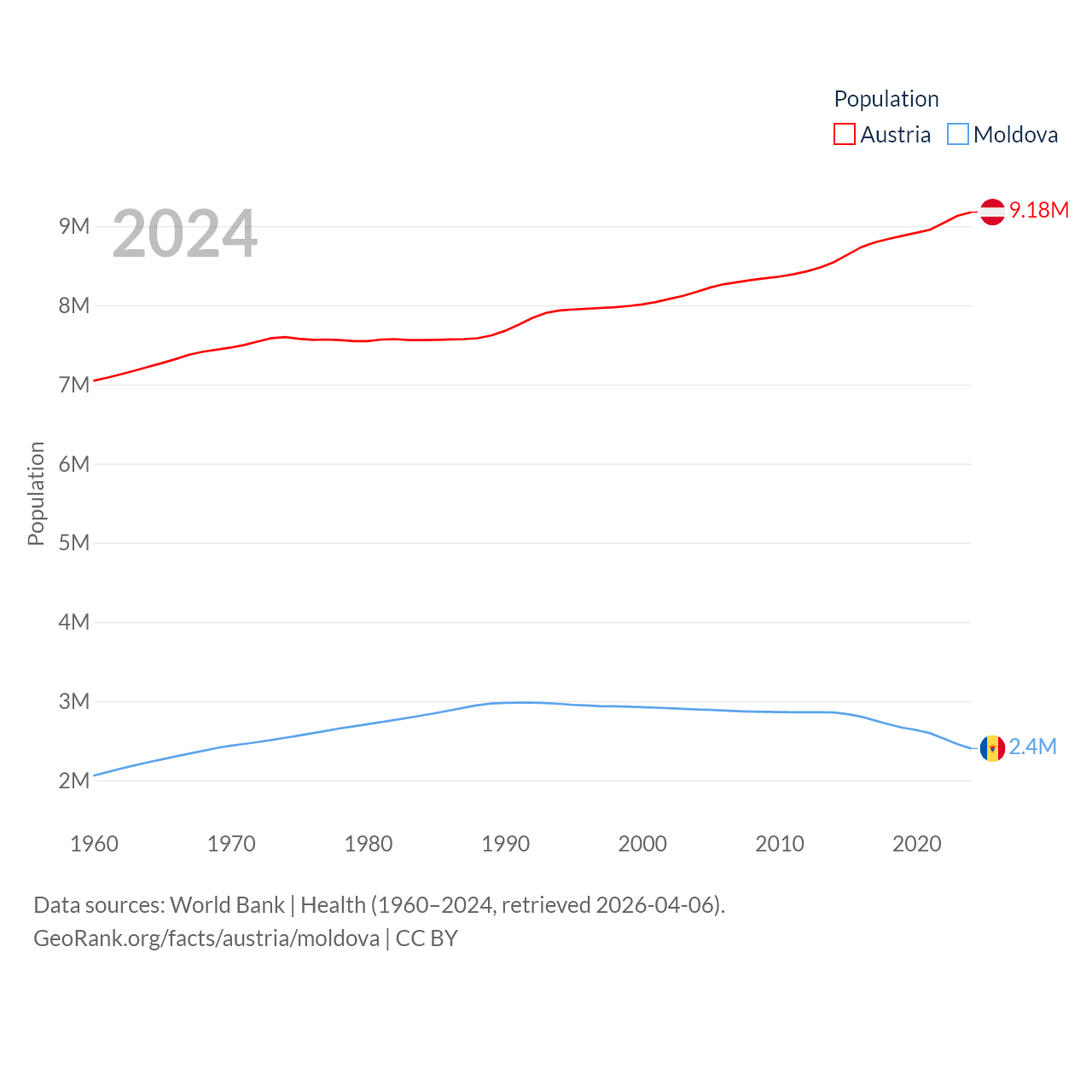 Austria has a population of 9.18M (ranked 99/197), compared with 2.4M in Moldova (ranked 143/197). Austria's land area is 31,861 sq mi versus 12,714 sq mi for Moldova (ranked 113th vs. 135th).