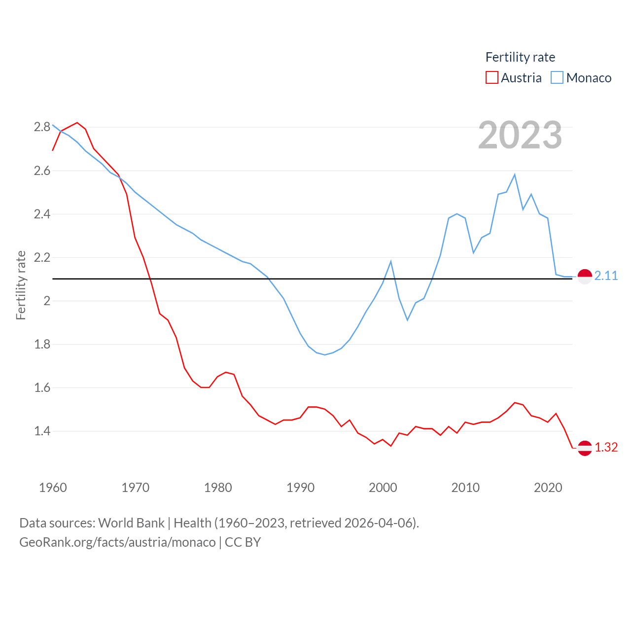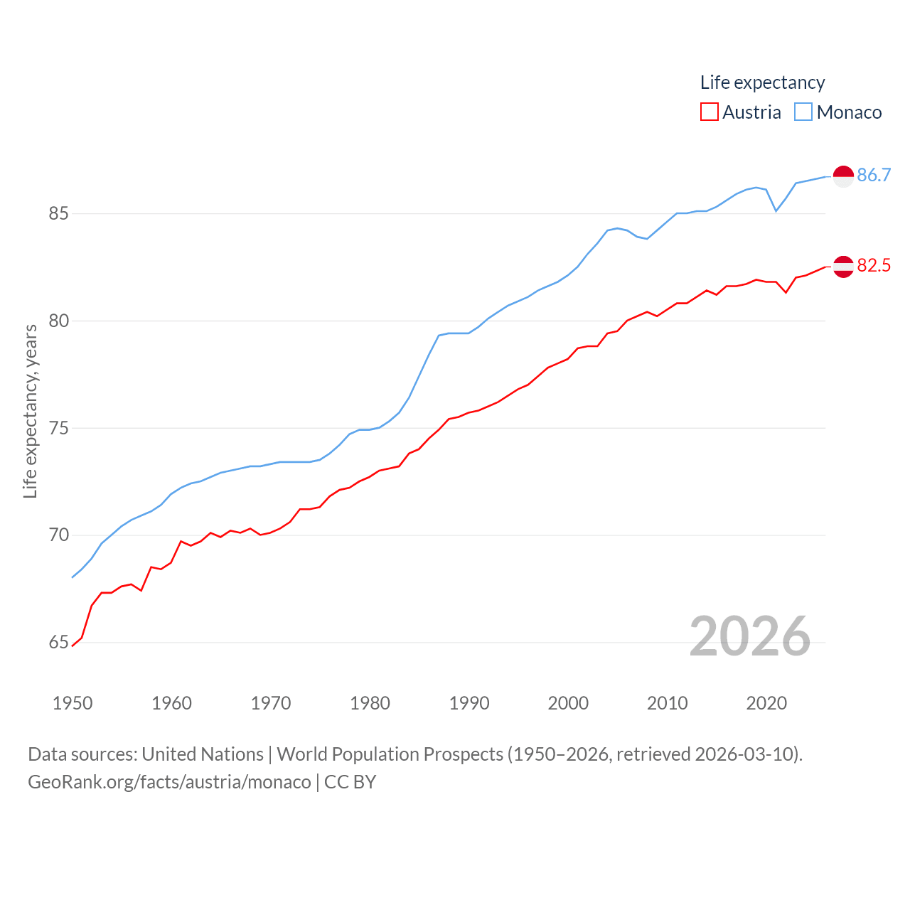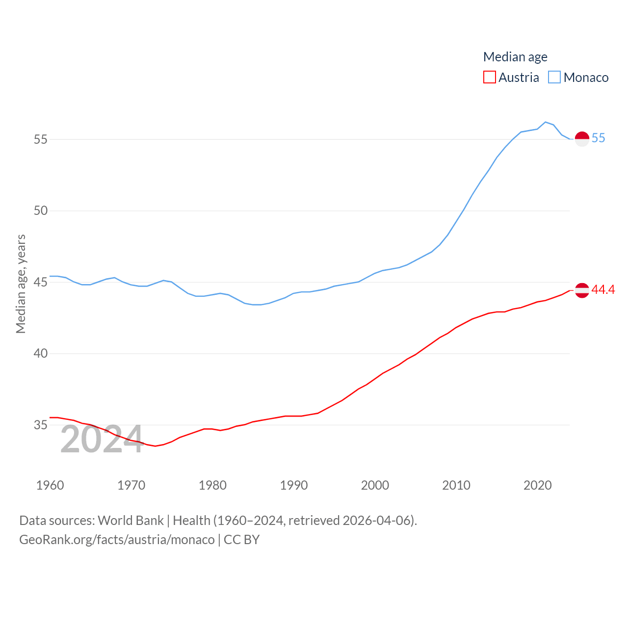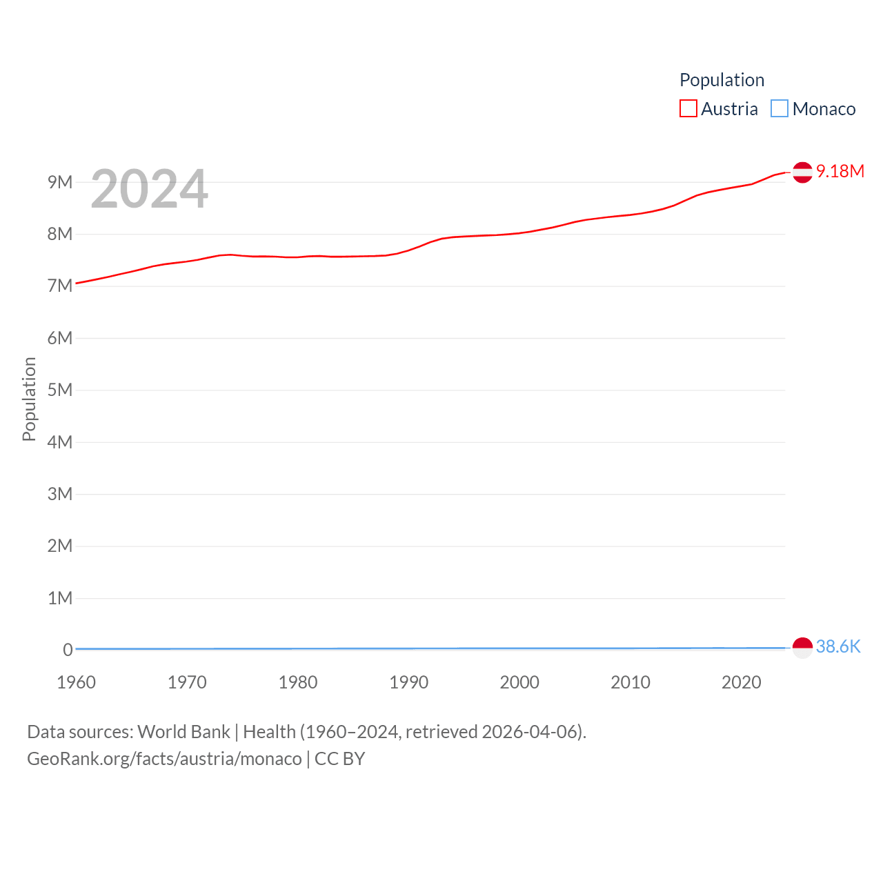 Austria has a population of 9.18M (ranked 99/197), compared with 38.6K in Monaco (ranked 191/197). Austria's land area is 31,861 sq mi versus 0.8 sq mi for Monaco (ranked 113th vs. 196th).