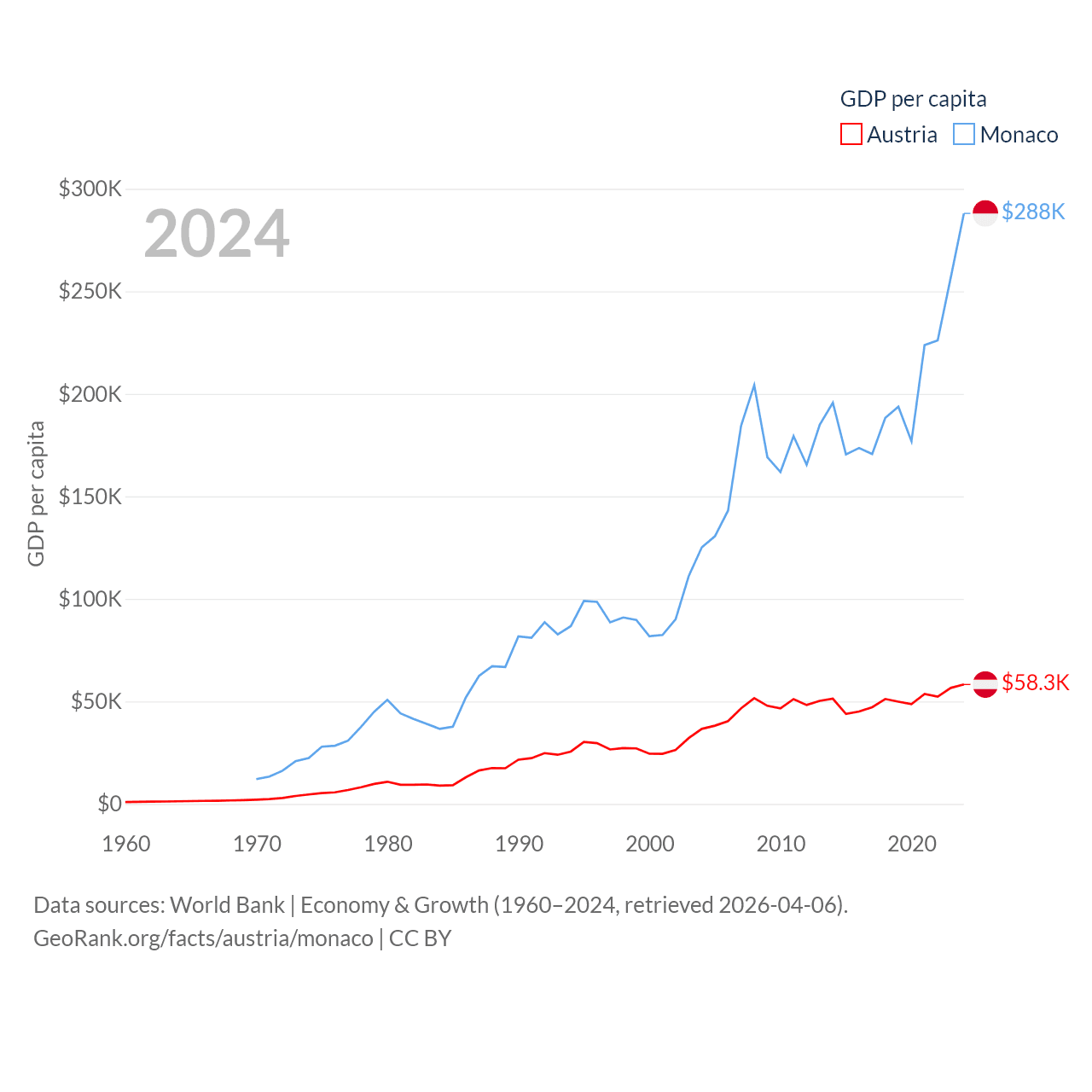 By GDP, Austria ranks 30/197 ($535B) and Monaco ranks 152/197 ($11.1B). By GDP per capita, Austria ranks 16/197 ($58,269), while Monaco ranks 1/197 ($288,001).