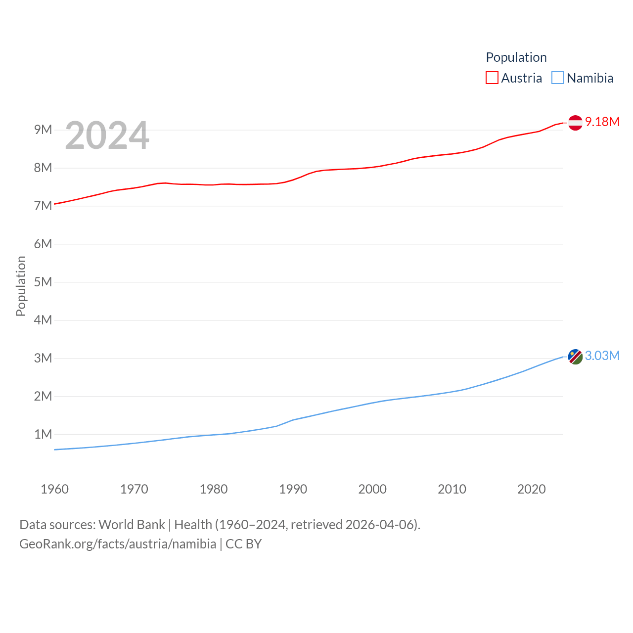 Austria has a population of 9.18M (ranked 99/197), compared with 3.03M in Namibia (ranked 136/197). Austria's land area is 31,861 sq mi versus 317,874 sq mi for Namibia (ranked 113th vs. 33rd).