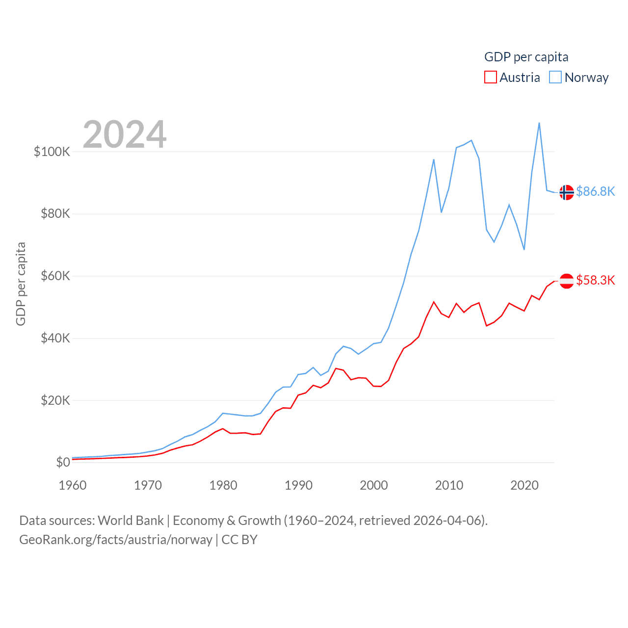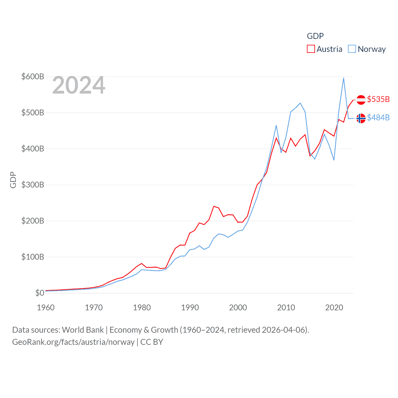 By GDP, Austria ranks 30/197 ($535B) and Norway ranks 32/197 ($484B). By GDP per capita, Austria ranks 16/197 ($58,269), while Norway ranks 8/197 ($86,785).