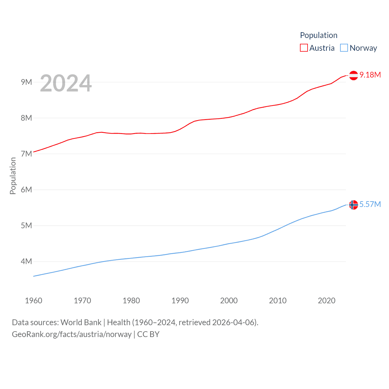 Austria has a population of 9.18M (ranked 99/197), compared with 5.57M in Norway (ranked 118/197). Austria's land area is 31,861 sq mi versus 140,645 sq mi for Norway (ranked 113th vs. 62nd).