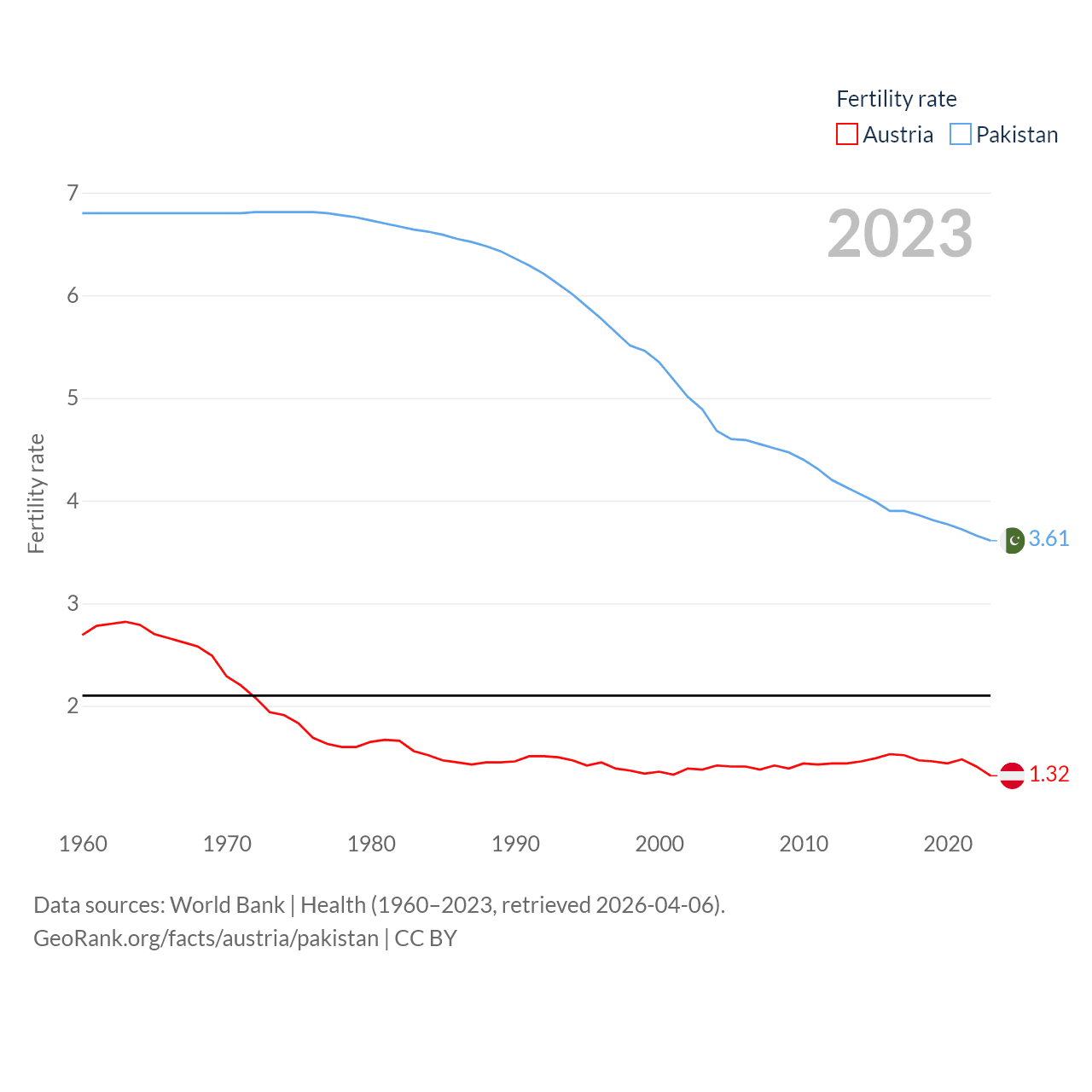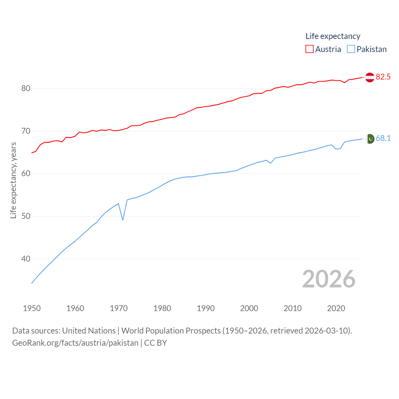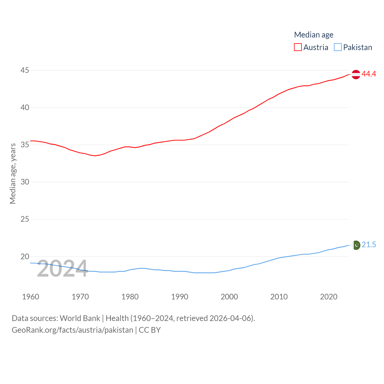 Austria has a population of 9.18M (ranked 99/197), compared with 251M in Pakistan (ranked 5/197). Austria's land area is 31,861 sq mi versus 297,638 sq mi for Pakistan (ranked 113th vs. 35th).