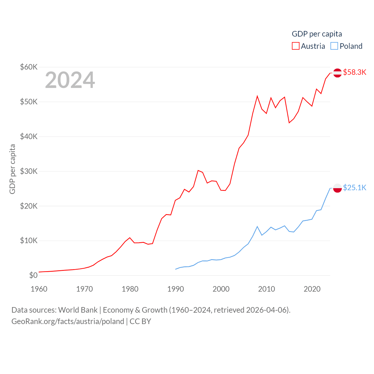 By GDP, Austria ranks 30/197 ($535B) and Poland ranks 21/197 ($918B). By GDP per capita, Austria ranks 16/197 ($58,269), while Poland ranks 48/197 ($25,104).