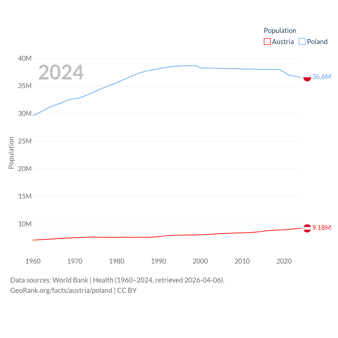 Austria has a population of 9.18M (ranked 99/197), compared with 36.6M in Poland (ranked 42/197). Austria's land area is 31,861 sq mi versus 118,252 sq mi for Poland (ranked 113th vs. 69th).
