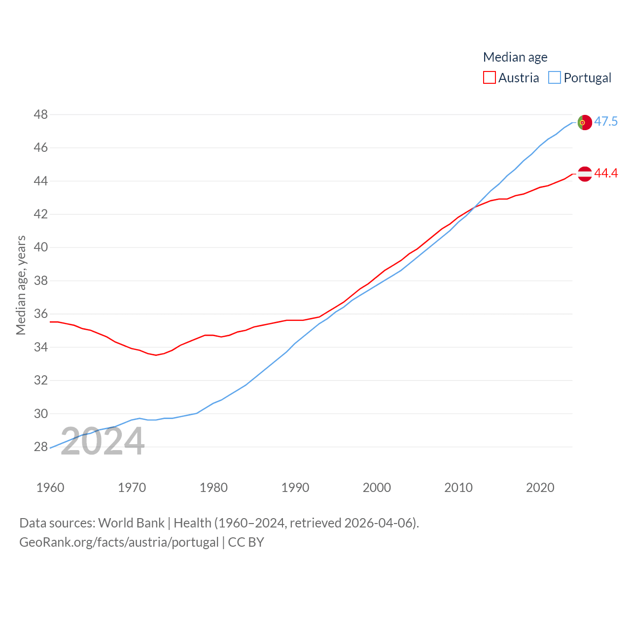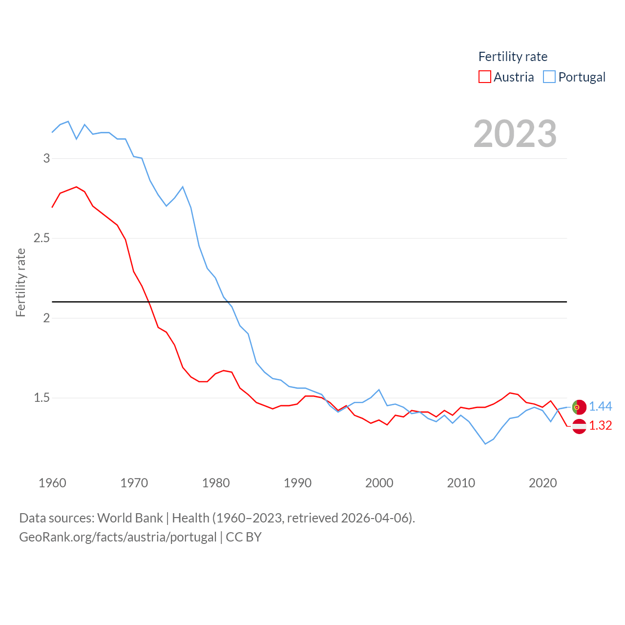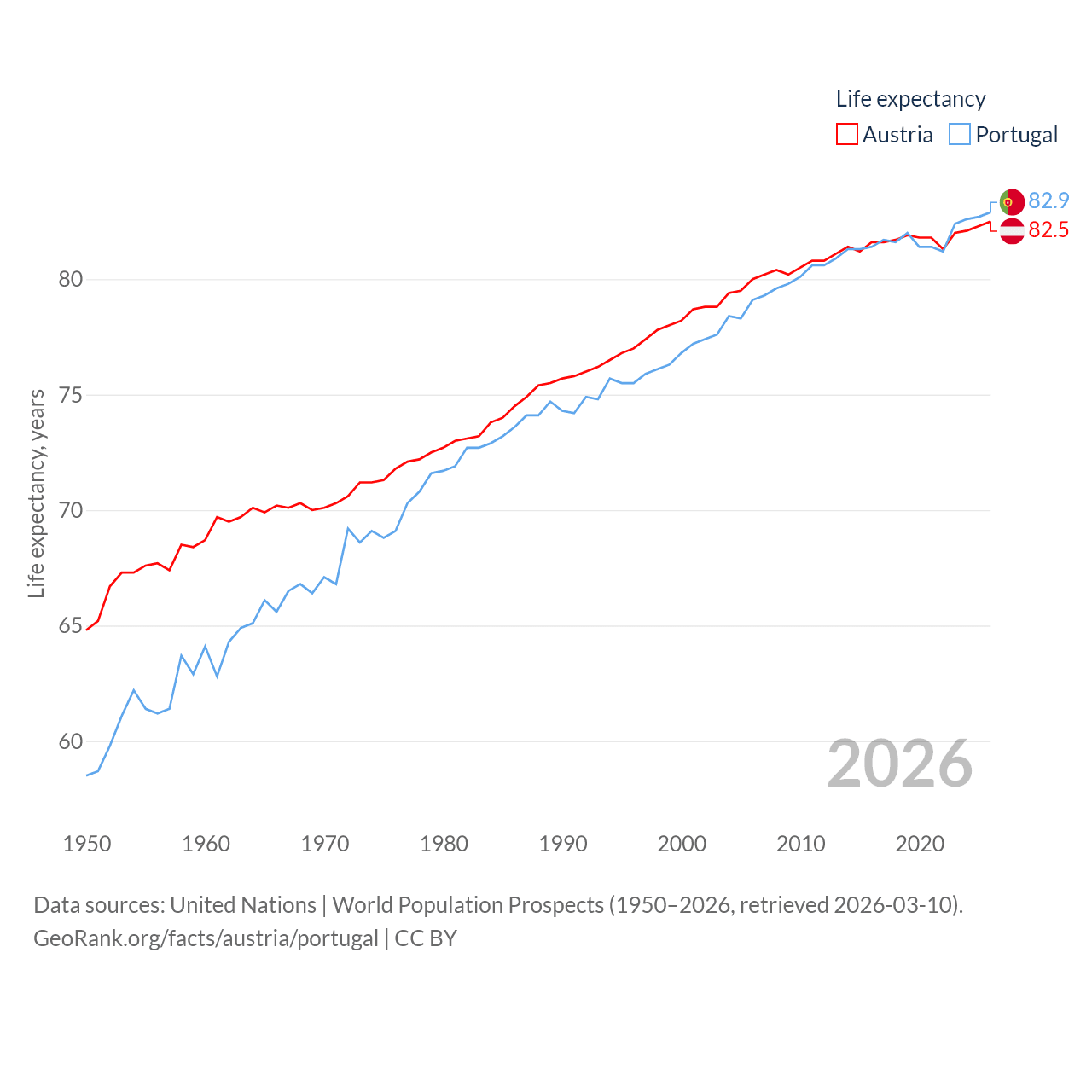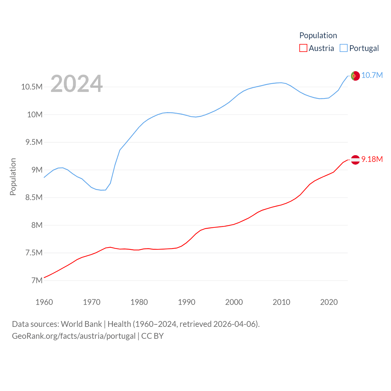 Austria has a population of 9.18M (ranked 99/197), compared with 10.7M in Portugal (ranked 90/197). Austria's land area is 31,861 sq mi versus 35,369 sq mi for Portugal (ranked 113th vs. 108th).