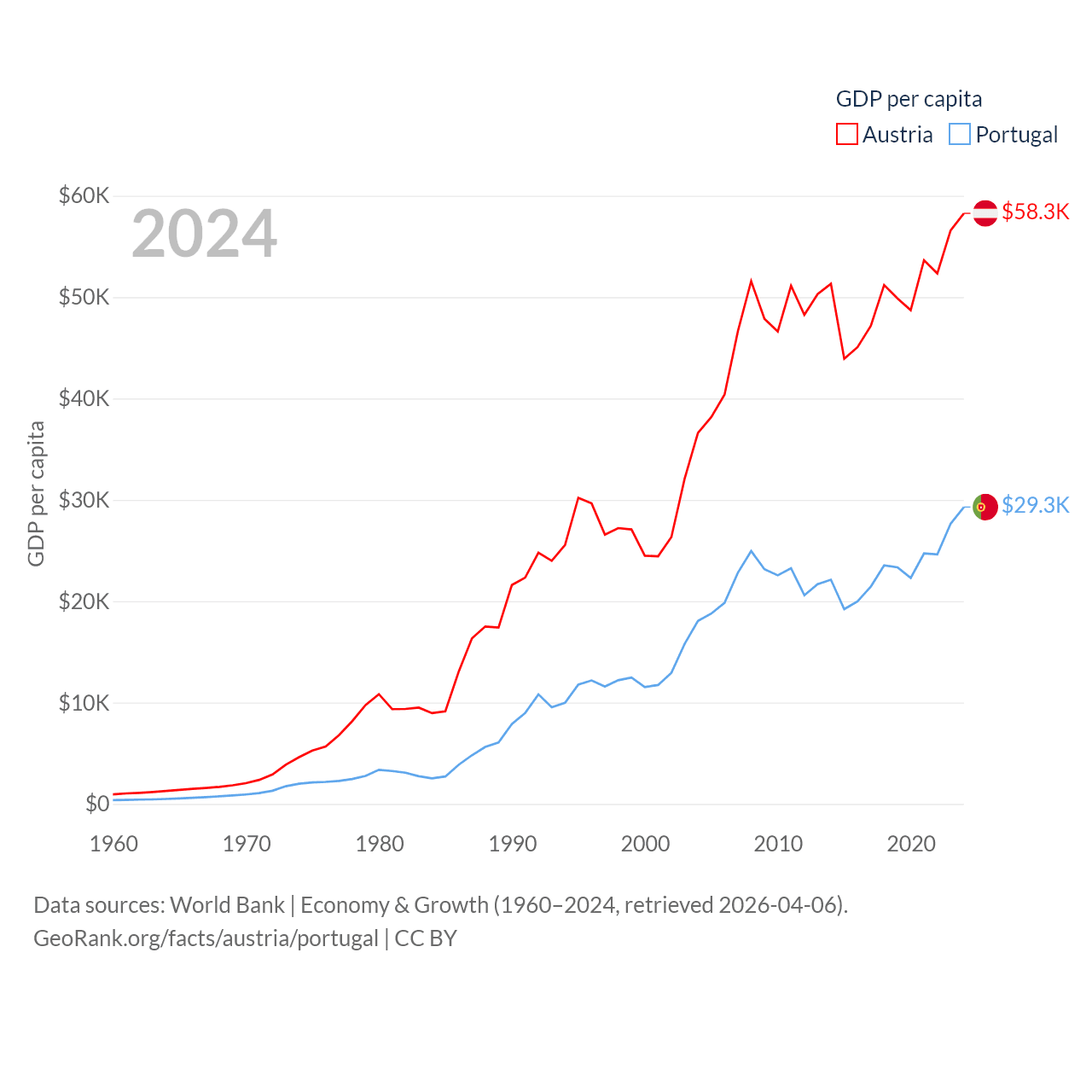 By GDP, Austria ranks 30/197 ($535B) and Portugal ranks 46/197 ($313B). By GDP per capita, Austria ranks 16/197 ($58,269), while Portugal ranks 44/197 ($29,292).
