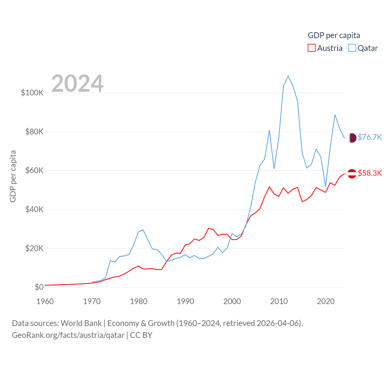 By GDP, Austria ranks 30/197 ($535B) and Qatar ranks 56/197 ($219B). By GDP per capita, Austria ranks 16/197 ($58,269), while Qatar ranks 11/197 ($76,689).