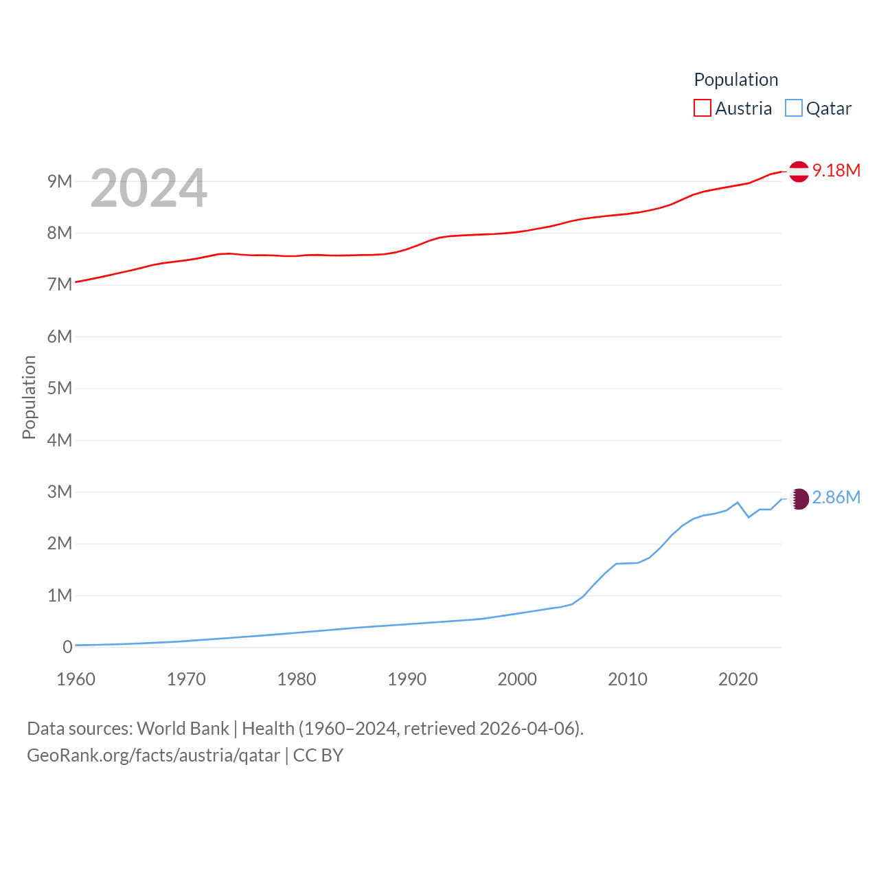 Austria has a population of 9.18M (ranked 99/197), compared with 2.86M in Qatar (ranked 138/197). Austria's land area is 31,861 sq mi versus 4,436 sq mi for Qatar (ranked 113th vs. 158th).