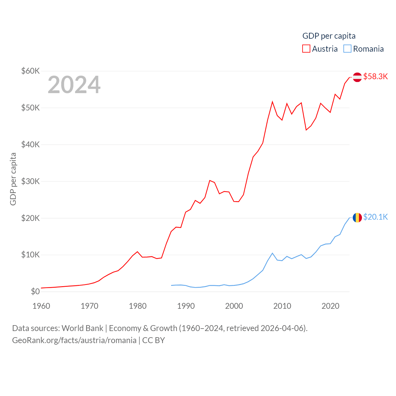 By GDP, Austria ranks 30/197 ($535B) and Romania ranks 42/197 ($383B). By GDP per capita, Austria ranks 16/197 ($58,269), while Romania ranks 58/197 ($20,080).