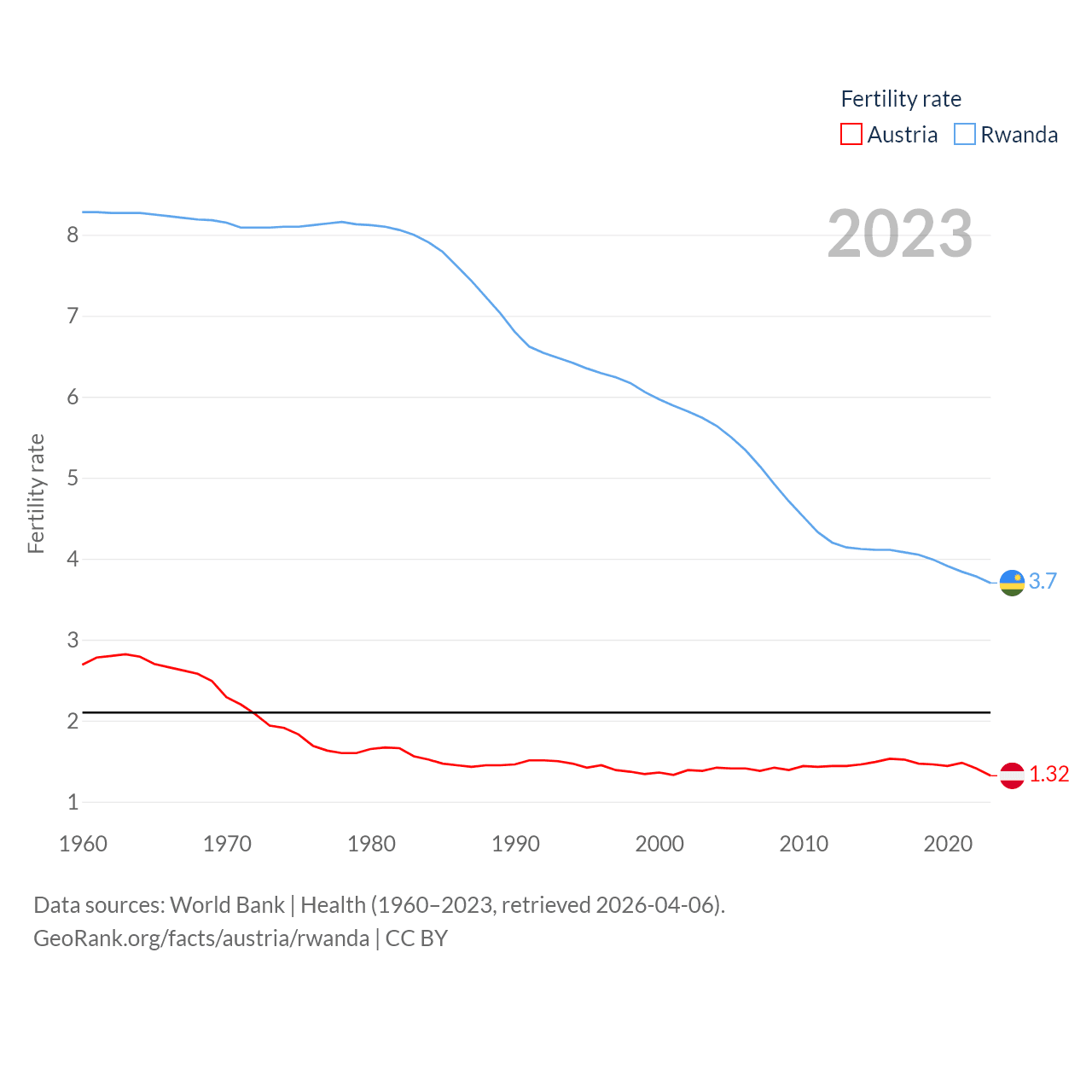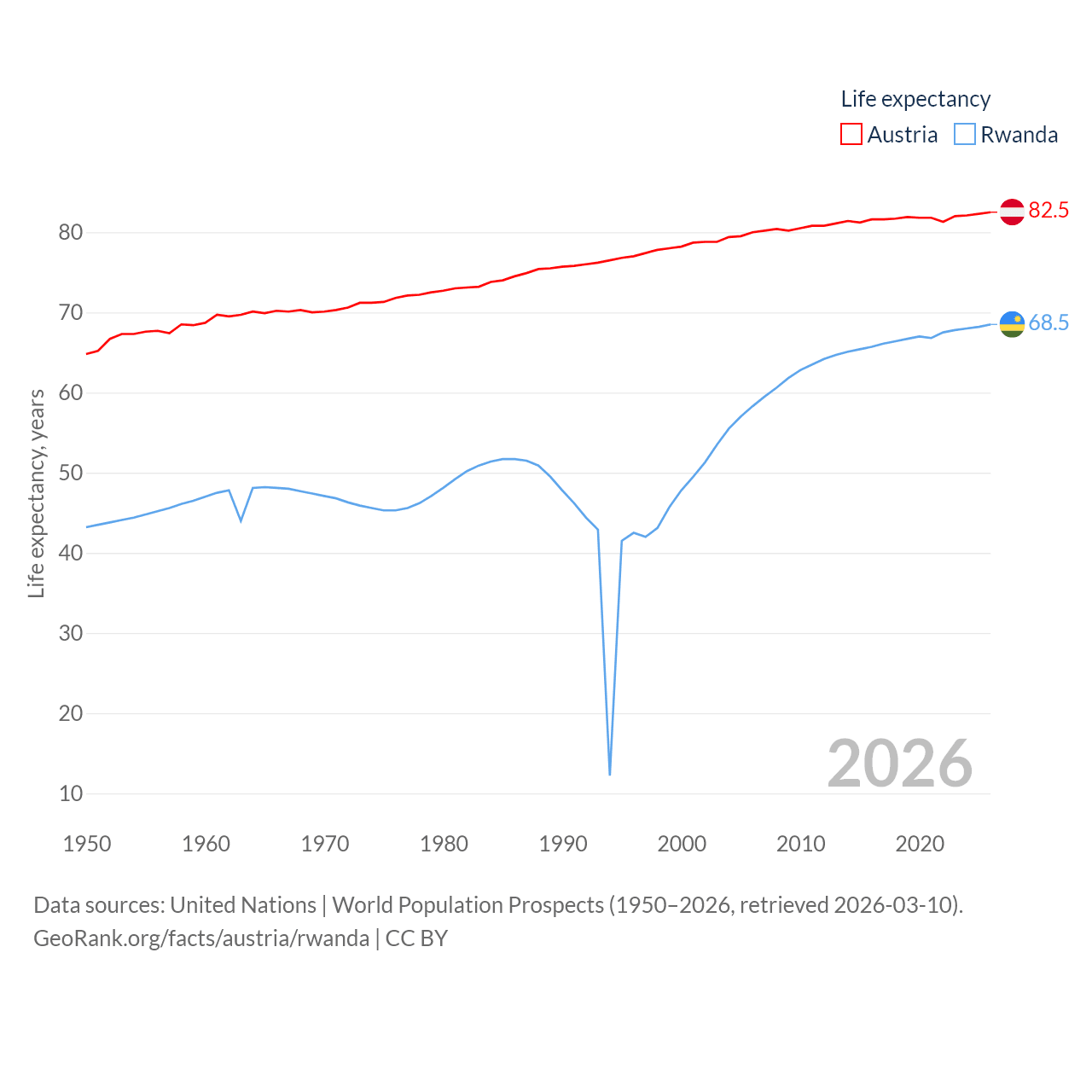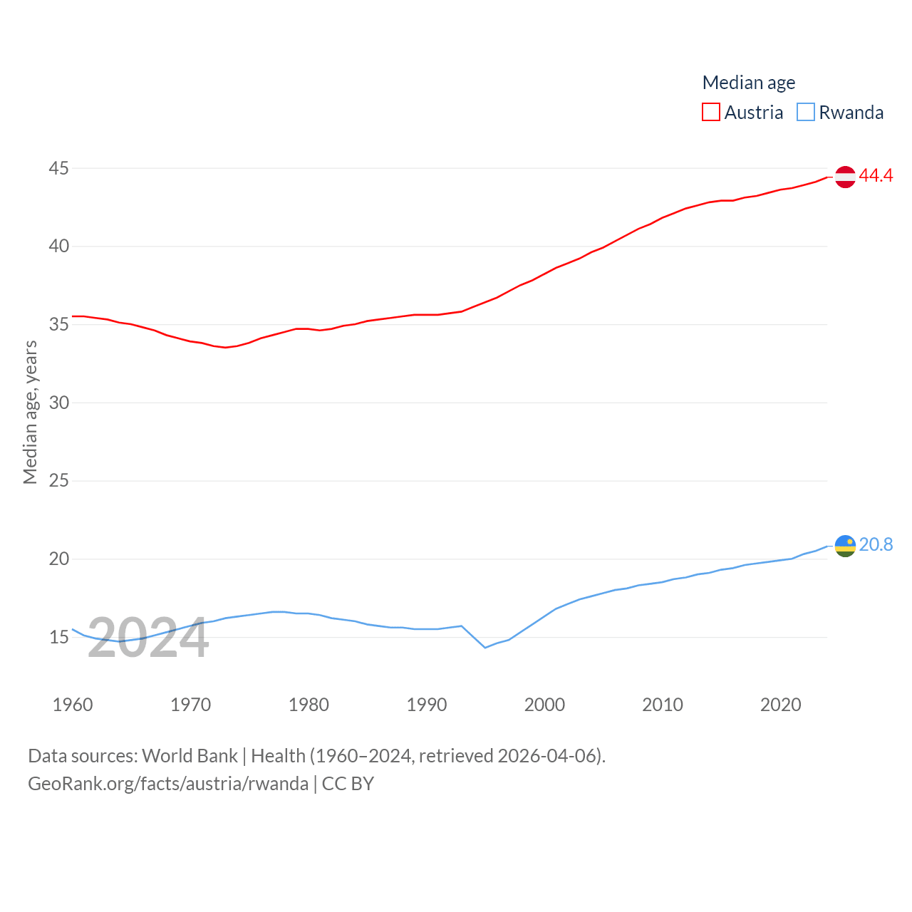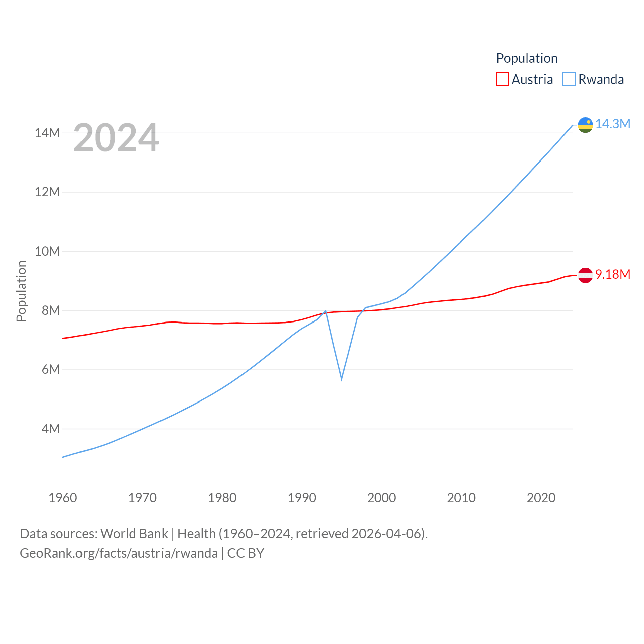 Austria has a population of 9.18M (ranked 99/197), compared with 14.3M in Rwanda (ranked 77/197). Austria's land area is 31,861 sq mi versus 9,525 sq mi for Rwanda (ranked 113th vs. 146th).