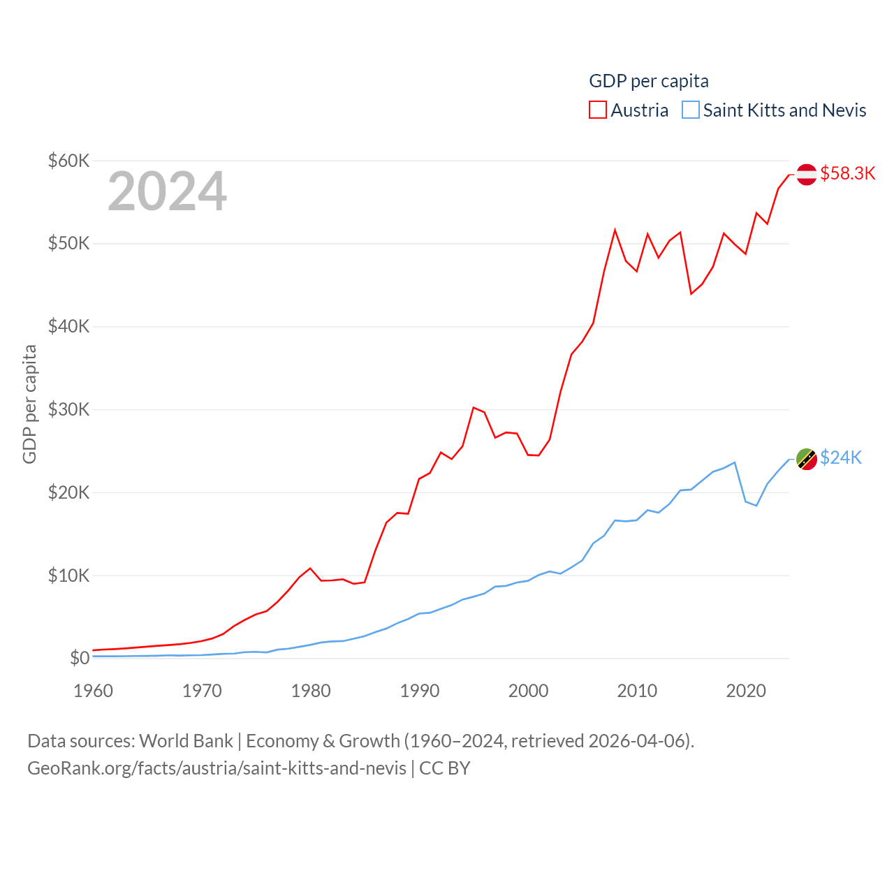 By GDP, Austria ranks 30/197 ($535B) and Saint Kitts and Nevis ranks 187/197 ($1.12B). By GDP per capita, Austria ranks 16/197 ($58,269), while Saint Kitts and Nevis ranks 51/197 ($23,961).