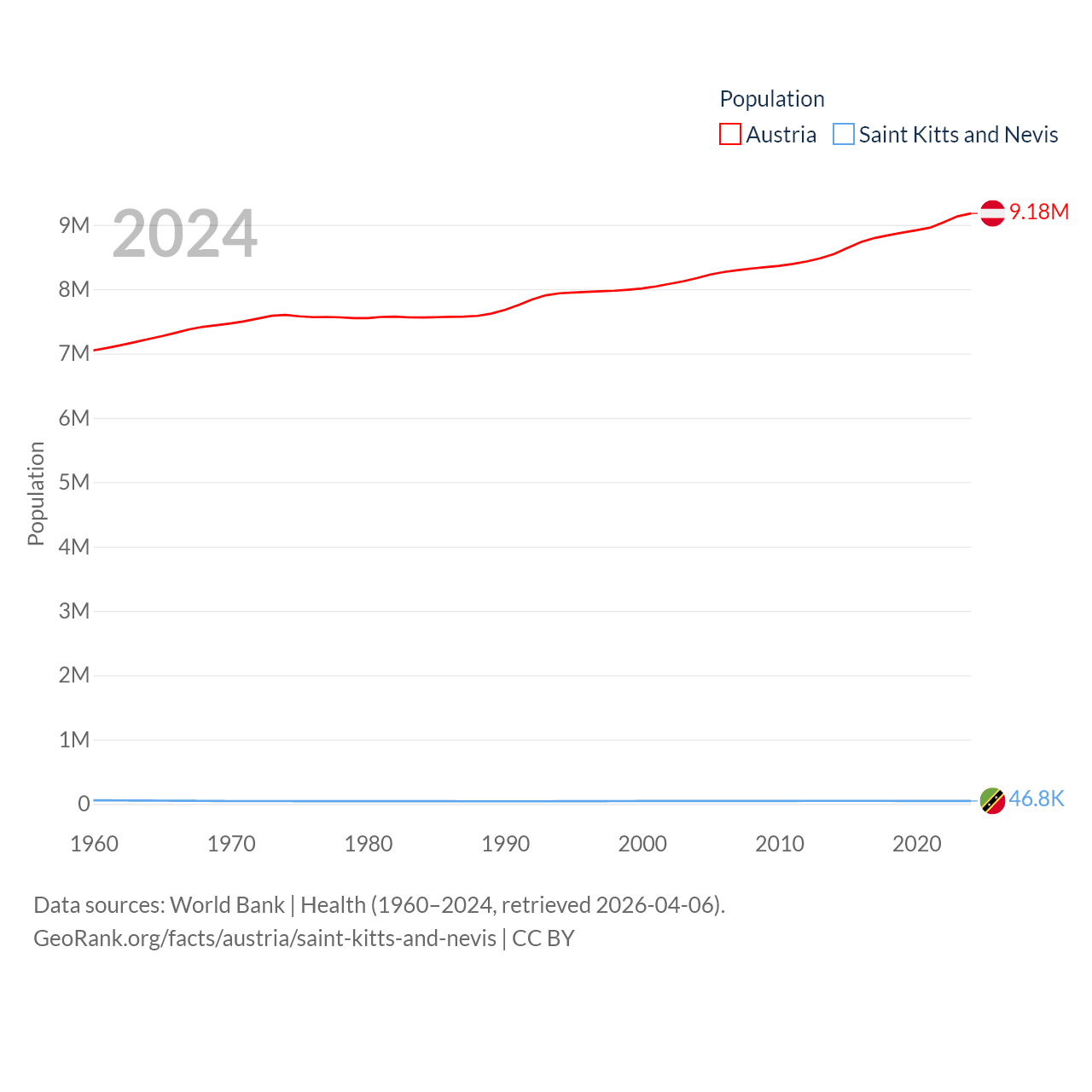 Austria has a population of 9.18M (ranked 99/197), compared with 46.8K in Saint Kitts and Nevis (ranked 189/197). Austria's land area is 31,861 sq mi versus 100.4 sq mi for Saint Kitts and Nevis (ranked 113th vs. 189th).