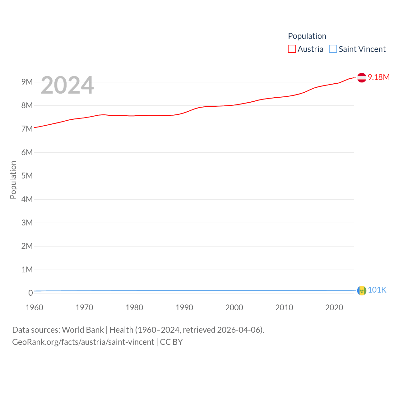 Austria has a population of 9.18M (ranked 99/197), compared with 101K in Saint Vincent (ranked 184/197). Austria's land area is 31,861 sq mi versus 150.6 sq mi for Saint Vincent (ranked 113th vs. 185th).