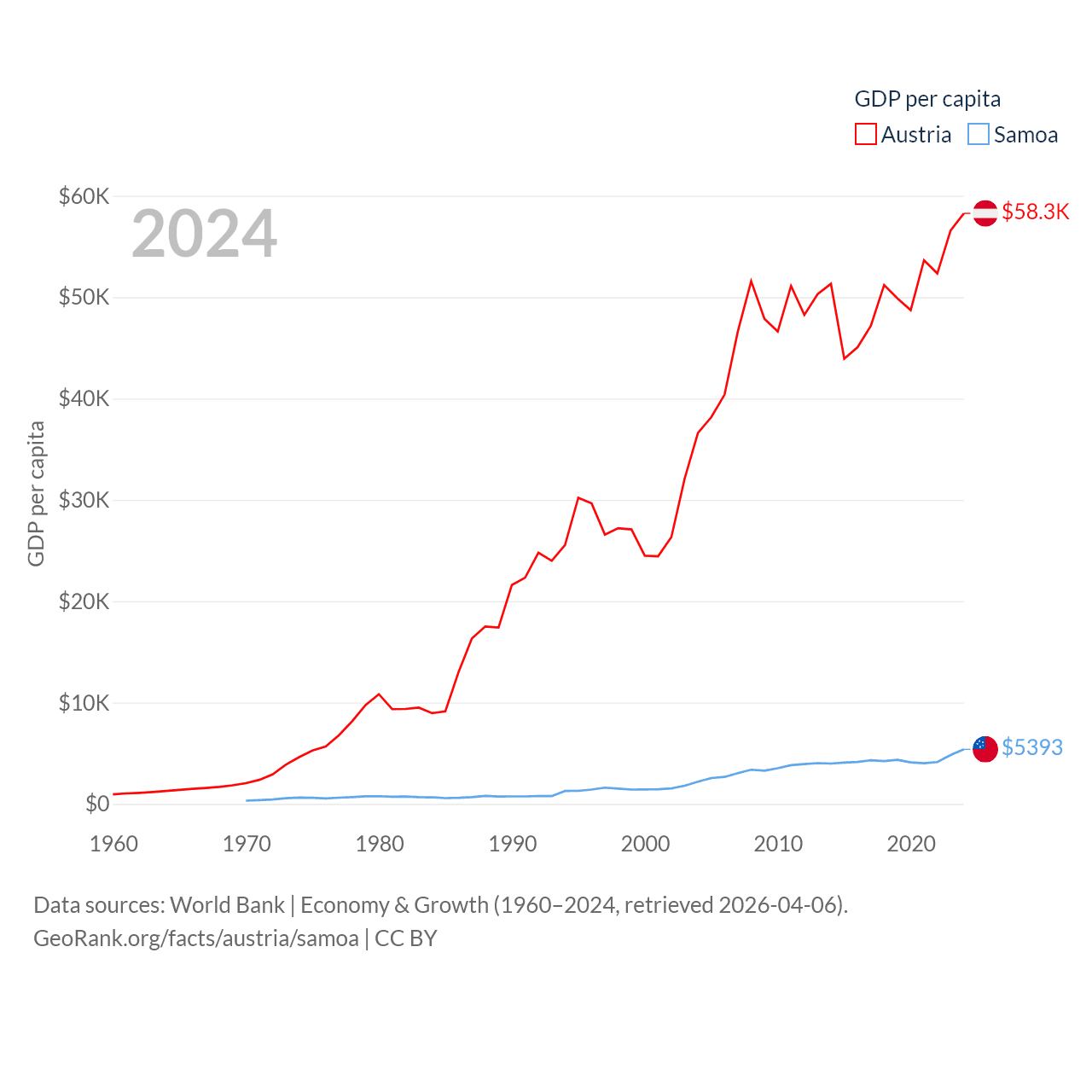By GDP, Austria ranks 30/197 ($535B) and Samoa ranks 185/197 ($1.18B). By GDP per capita, Austria ranks 16/197 ($58,269), while Samoa ranks 117/197 ($5,393).