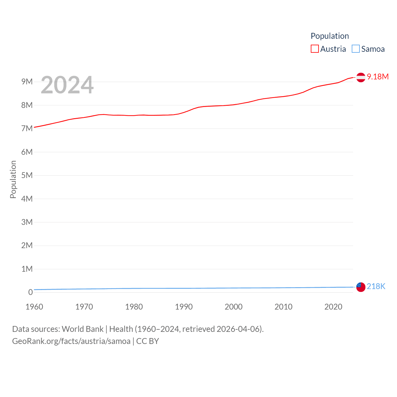 Austria has a population of 9.18M (ranked 99/197), compared with 218K in Samoa (ranked 177/197). Austria's land area is 31,861 sq mi versus 1,073 sq mi for Samoa (ranked 113th vs. 168th).