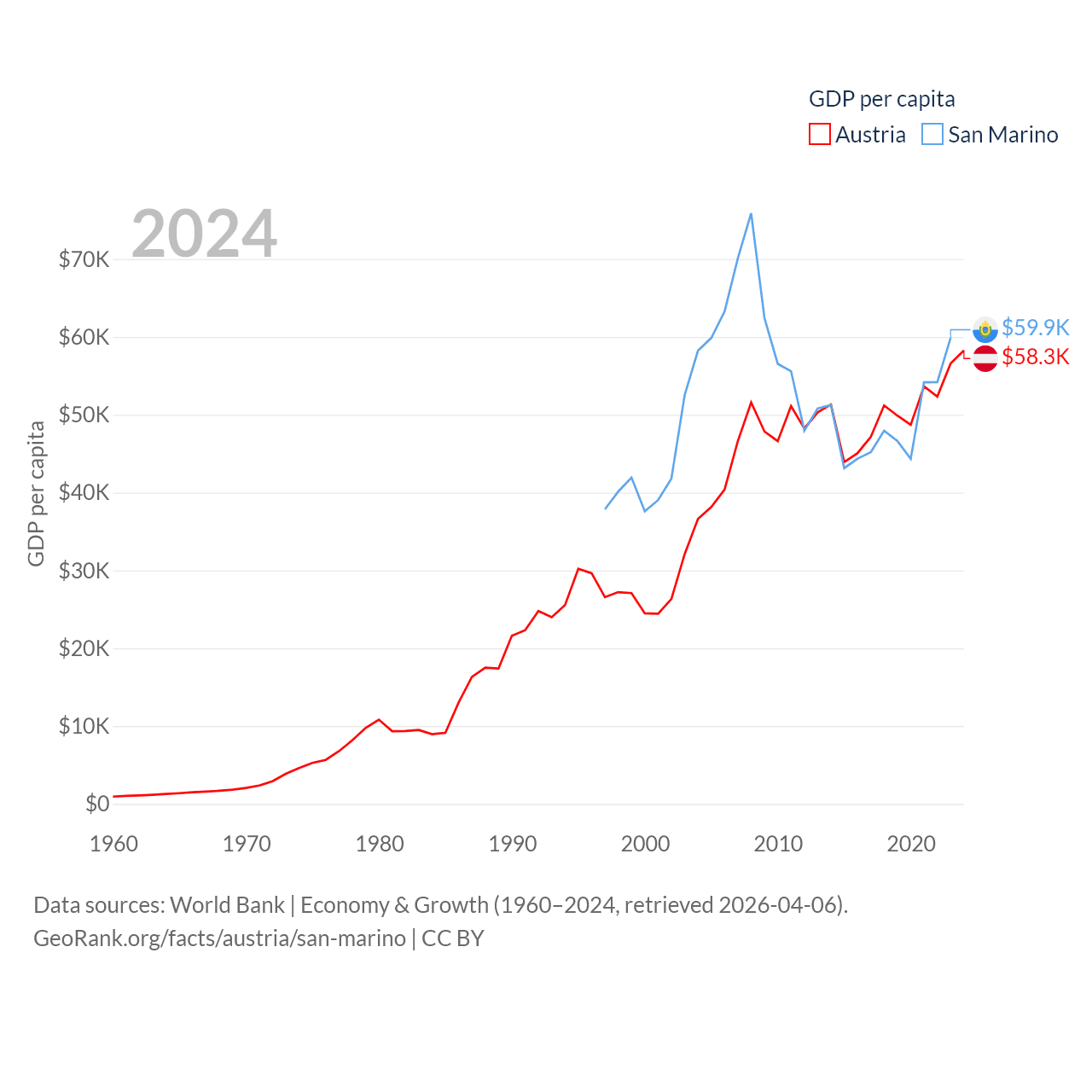 By GDP, Austria ranks 30/197 ($535B) and San Marino ranks 180/197 ($2.03B). By GDP per capita, Austria ranks 16/197 ($58,269), while San Marino ranks 15/197 ($59,880).