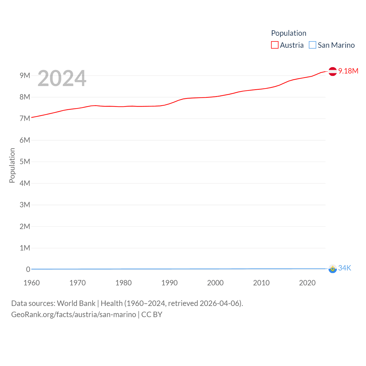 Austria has a population of 9.18M (ranked 99/197), compared with 34K in San Marino (ranked 193/197). Austria's land area is 31,861 sq mi versus 23.2 sq mi for San Marino (ranked 113th vs. 193rd).
