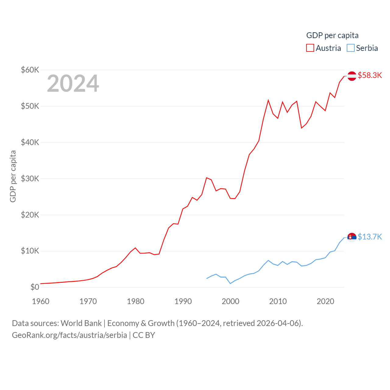 By GDP, Austria ranks 30/197 ($535B) and Serbia ranks 76/197 ($90.1B). By GDP per capita, Austria ranks 16/197 ($58,269), while Serbia ranks 73/197 ($13,679).
