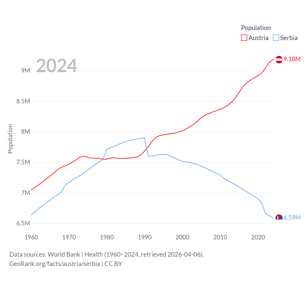 Austria has a population of 9.18M (ranked 99/197), compared with 6.59M in Serbia (ranked 109/197). Austria's land area is 31,861 sq mi versus 32,467 sq mi for Serbia (ranked 113th vs. 111th).
