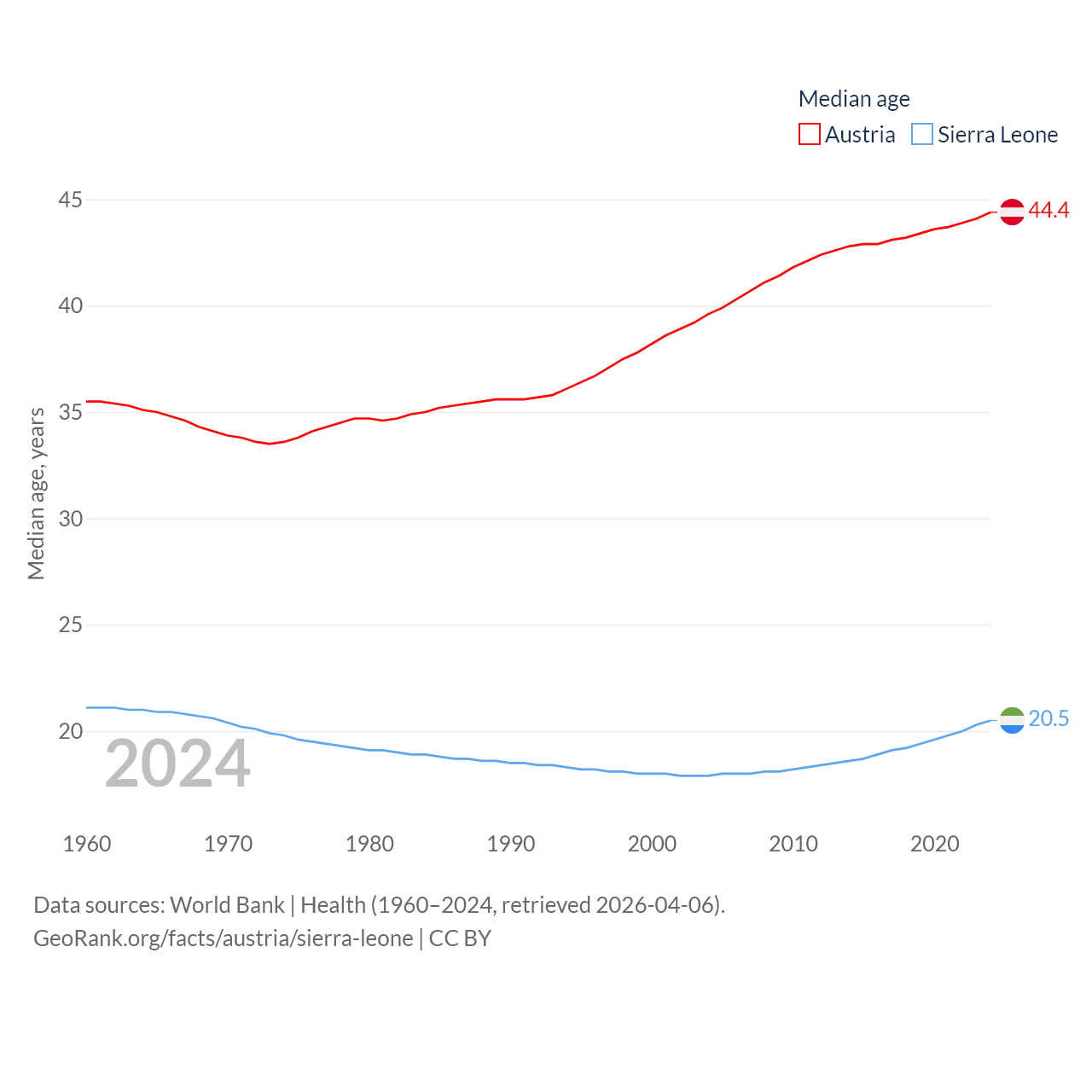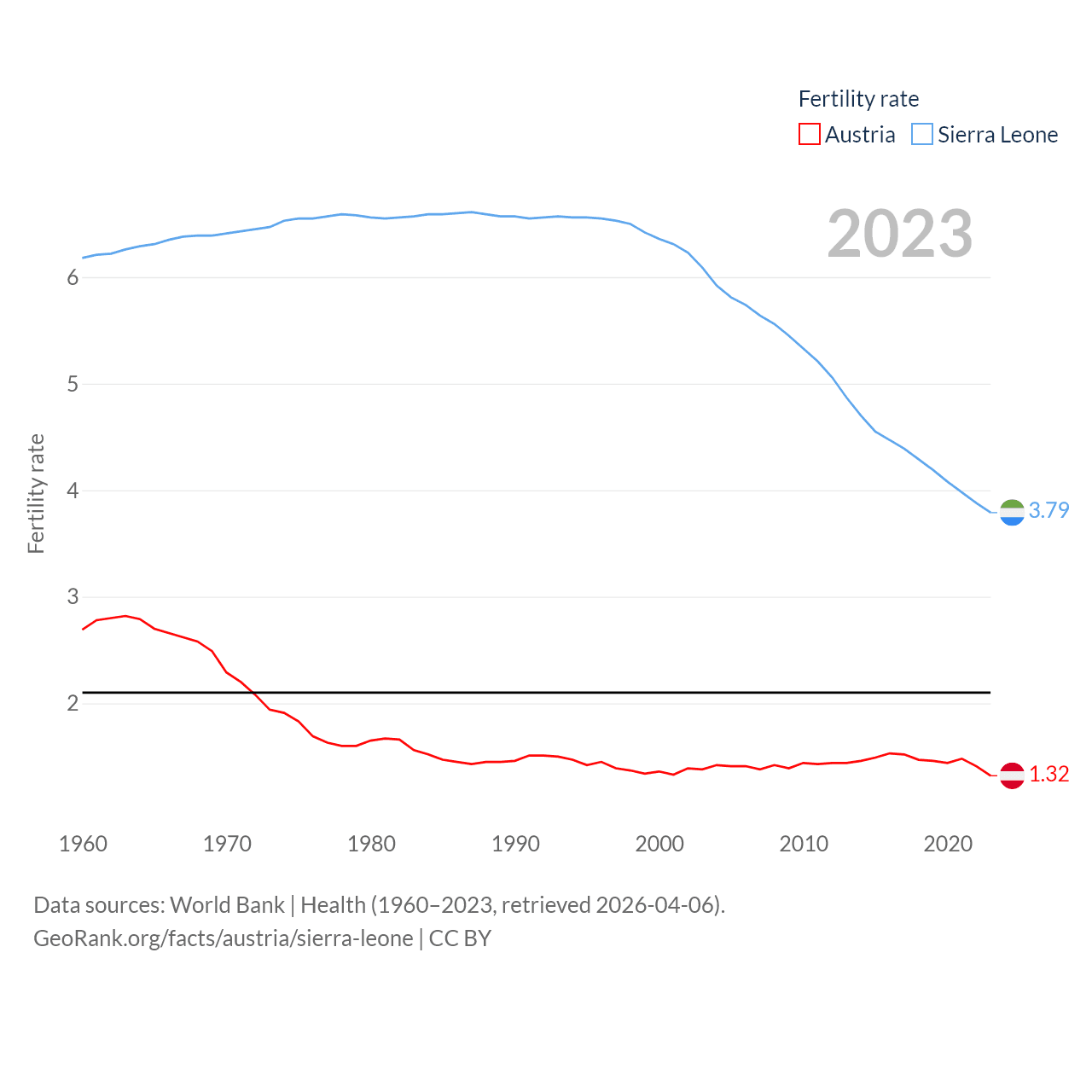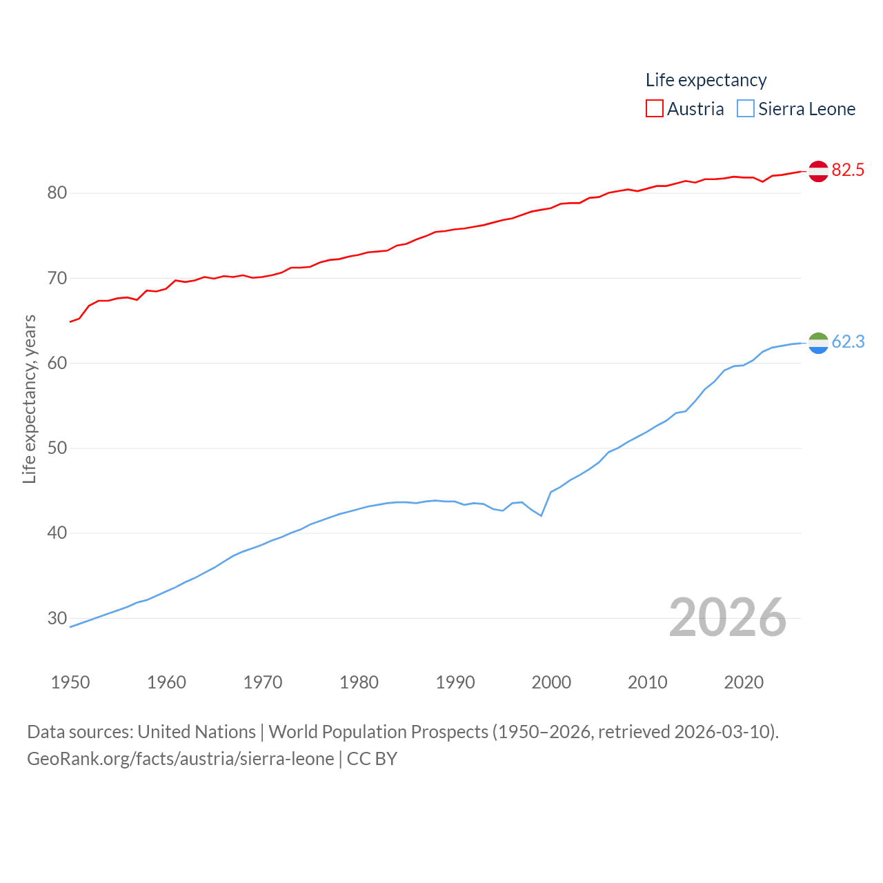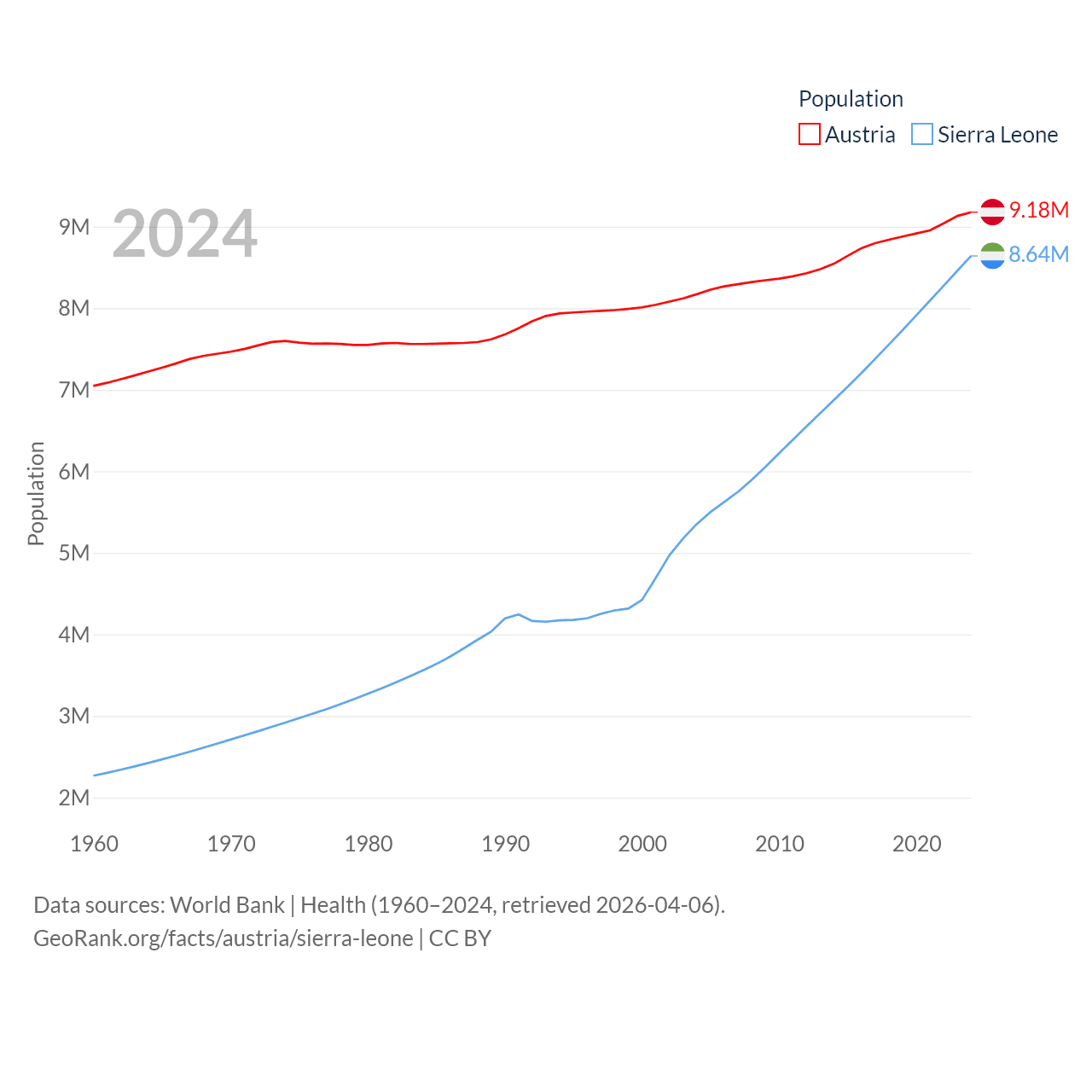 Austria has a population of 9.18M (ranked 99/197), compared with 8.64M in Sierra Leone (ranked 102/197). Austria's land area is 31,861 sq mi versus 27,869 sq mi for Sierra Leone (ranked 113th vs. 116th).